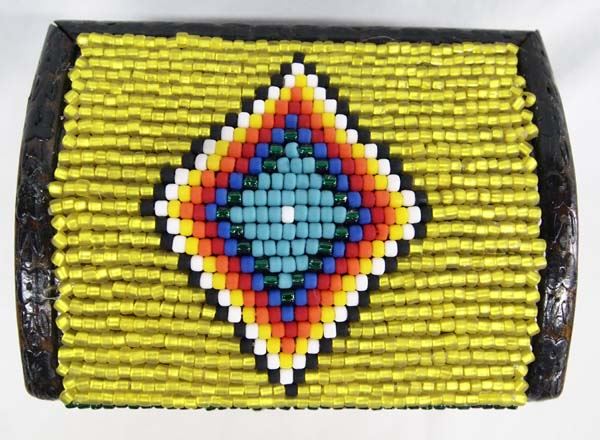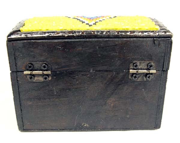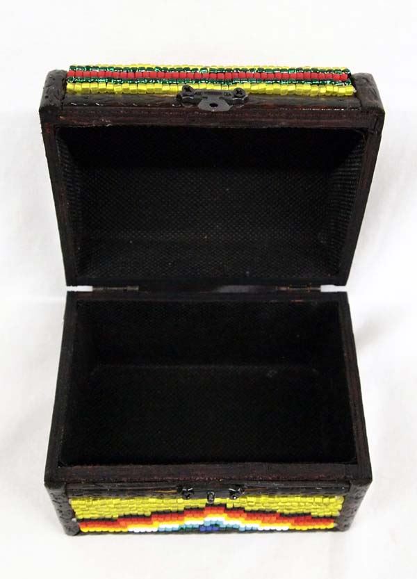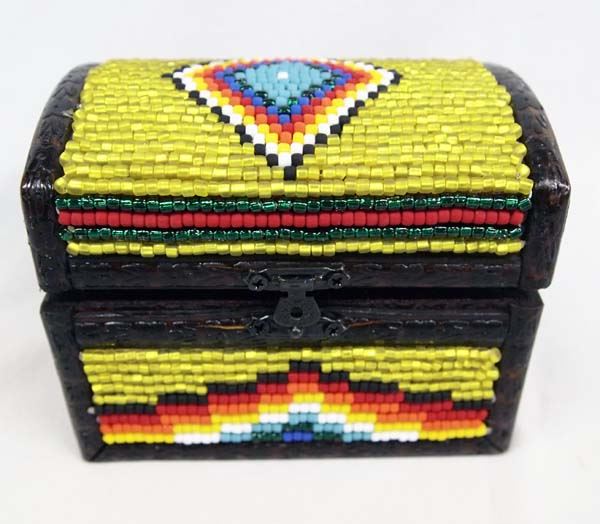 Hand Beaded Wood Treasure Chest by Kathy Kills Thunder, measures 5''L x 3.5''W x 3.5''H, beautifully beaded in both cool and warm colors, Artist Bio: Kathleen Kills Thunder (her legal name) was born in 1947 in Seattle, WA. Her father, Ben Kills Thunder, was a Sioux Indian from the Fort Peck Indian Reservation in NE Montana. Her mother was Spanish/Irish. Kathy grew up shuttling back and forth between Seattle and the Colville Indian Reservation in NE Washington. Kathy has been painting and beading since she was six. She uses a bright color palette and prodigious imagination in creating her painted and beaded work. Kathy currently lives in SE Arizona and raises buffalo when she is not pursuing her artistic endeavor