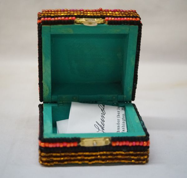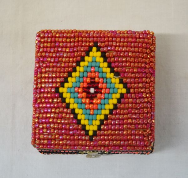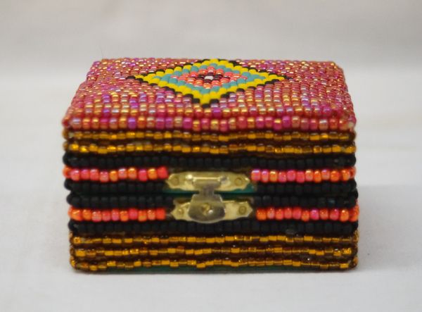 Hand Beaded Wooden Box by Kathy Kills Thunder, measures 2'' x 3.5'' x 3.5''Deep, beautifully beaded in predominantly warm colors, specifically metallic red, Artist Bio: Kathleen Kills Thunder was born in Seattle, Washington. Kathy has been painting and beading since she was six. She uses bright color palette and prodigious imagination in creating her painted and beaded work. Kathy currently lives in Southeast Arizona and raises buffalo when she is not pursuing her artistic endeavors.