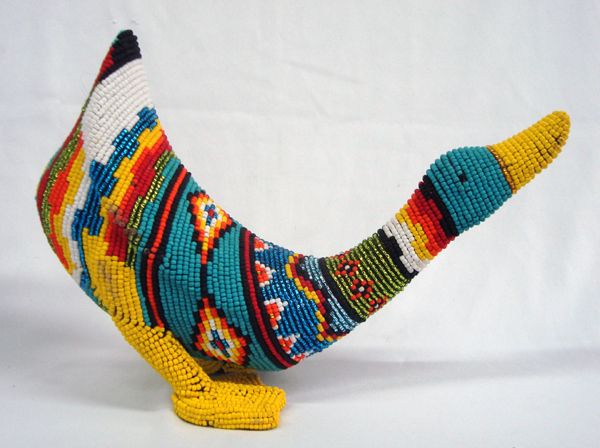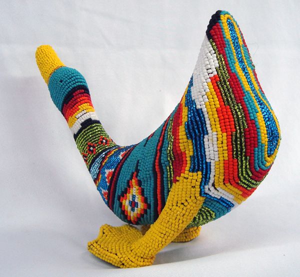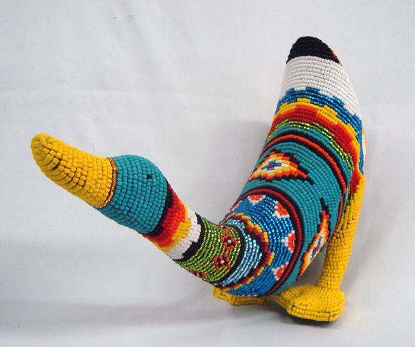 Hand Beaded Wooden Duck Figure - Kills Thunder. This is a solid wood carved duck that has been beautifully beaded by Arizona artist, Kills Thunder. It measures 13''H x 10''L x 5.5''W.