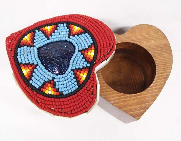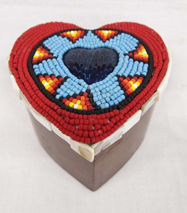 Hand Beaded Wooden Heart Trinket Box by Kills Thunder, measures 5''L x 5'' x 4''H