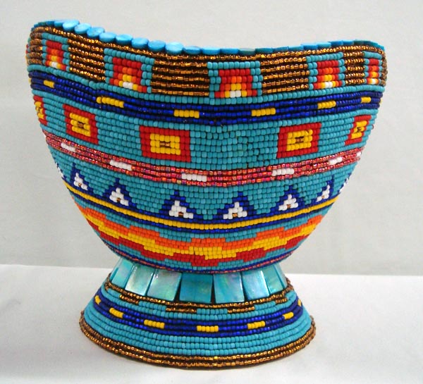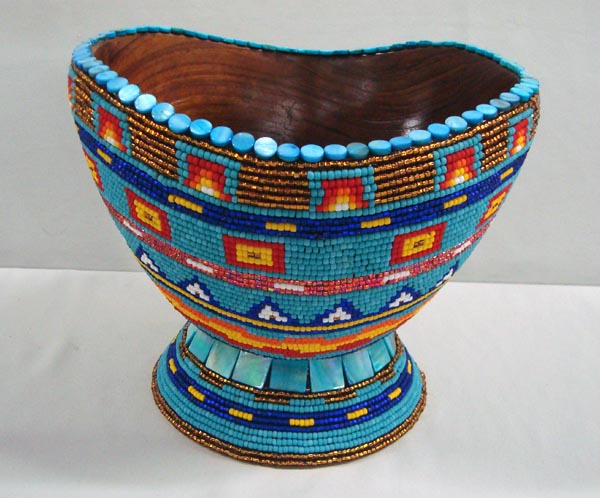 Hand Beaded Wooden Vase by Kills Thunder. Measures 10'' across the top. Buyers pay actual shipping and handling charges (see terms and conditions for more information.)