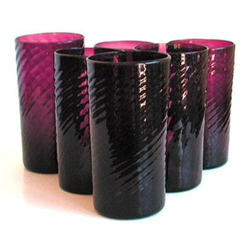 This gorgeous set of six (6) hand blown amethyst glass tumblers was produced around the 1960s. They have a spiral pattern, rough pontils and are all slightly differ sizes as no two hand blown glass items are identical. These truly beautiful and unique tumblers each measure about 5" tall x 3" across the rim and are all in excellent condition