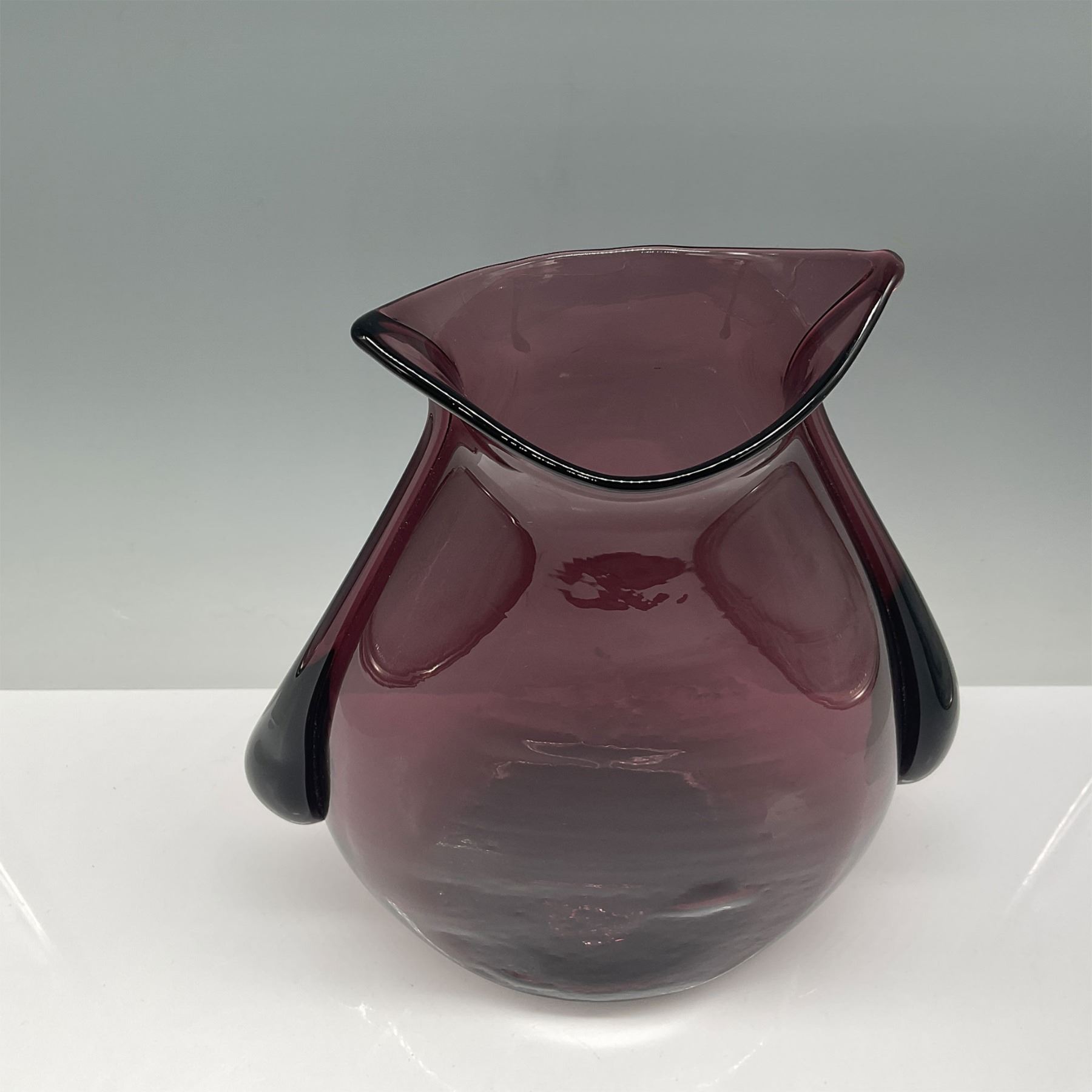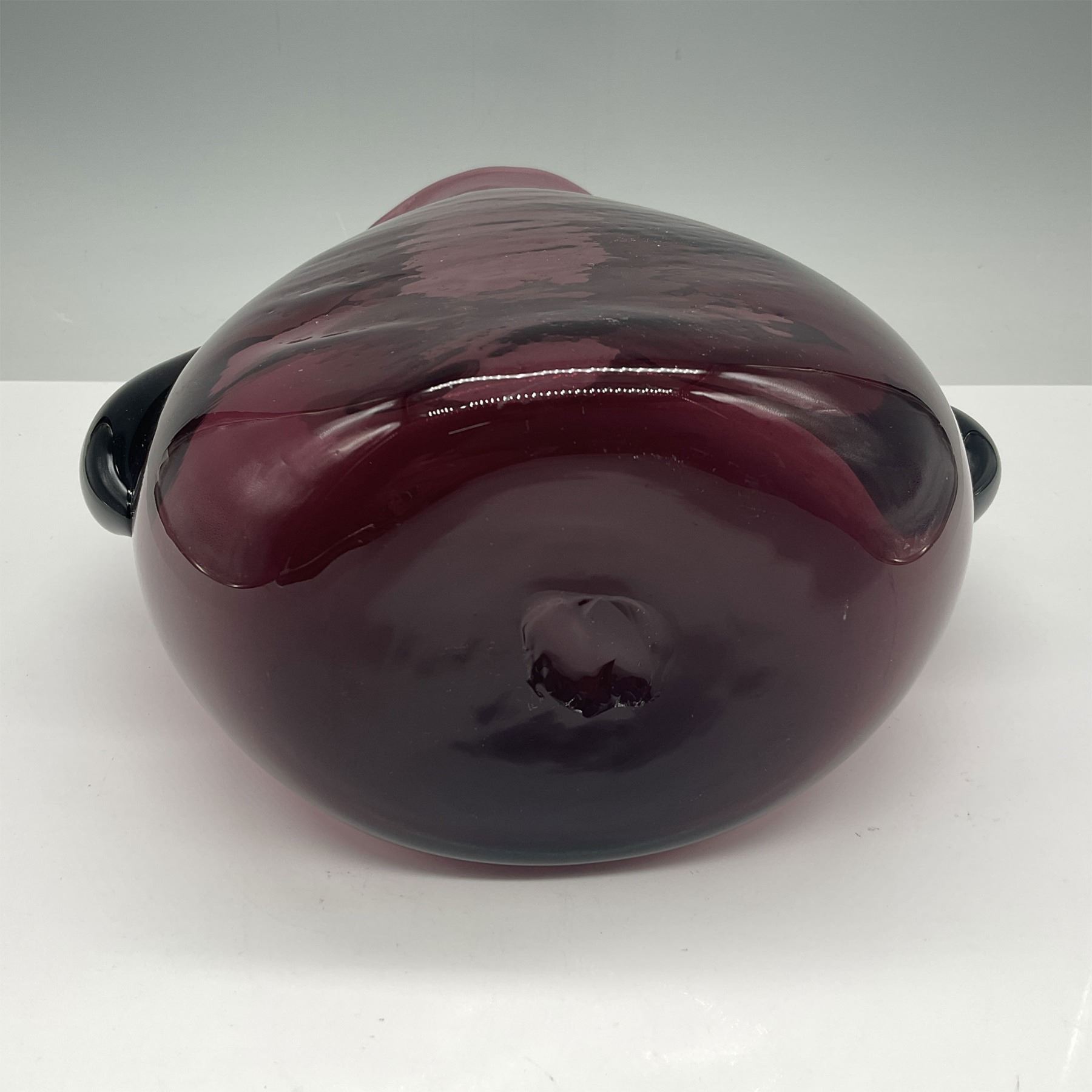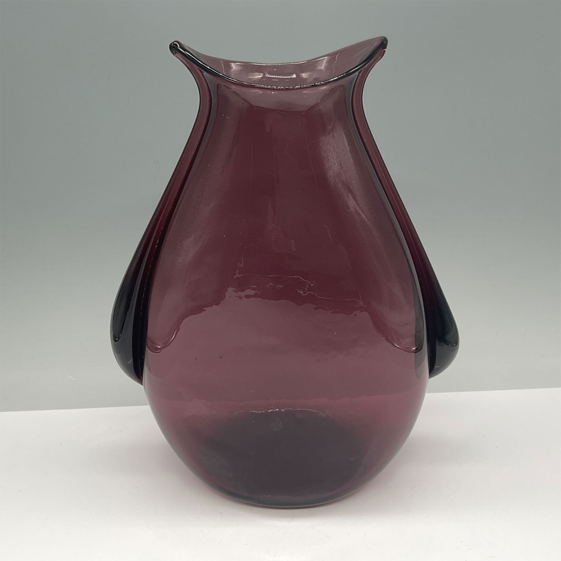 Stunning hand-blown art glass vase in a rich amethyst hue, featuring gracefully flared edges and prominent black teardrop-shaped accents on each side. The piece exhibits a smooth, polished pontil on the base, indicative of its handcrafted nature. Its contemporary yet timeless design highlights the artisans skill and the elegant interplay of color and form, making it a captivating centerpiece or decorative item.