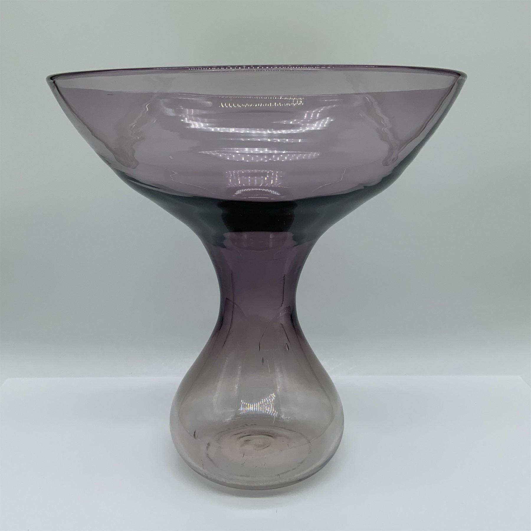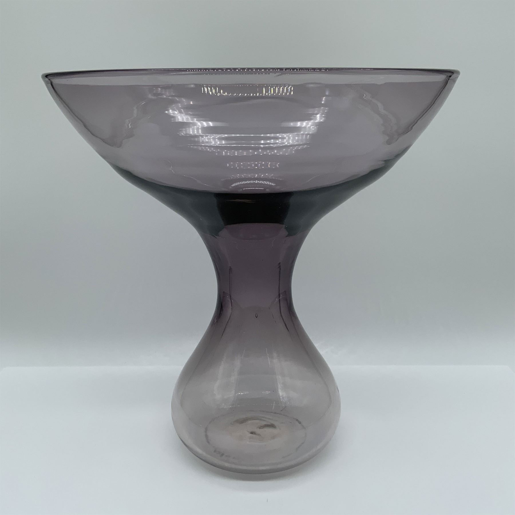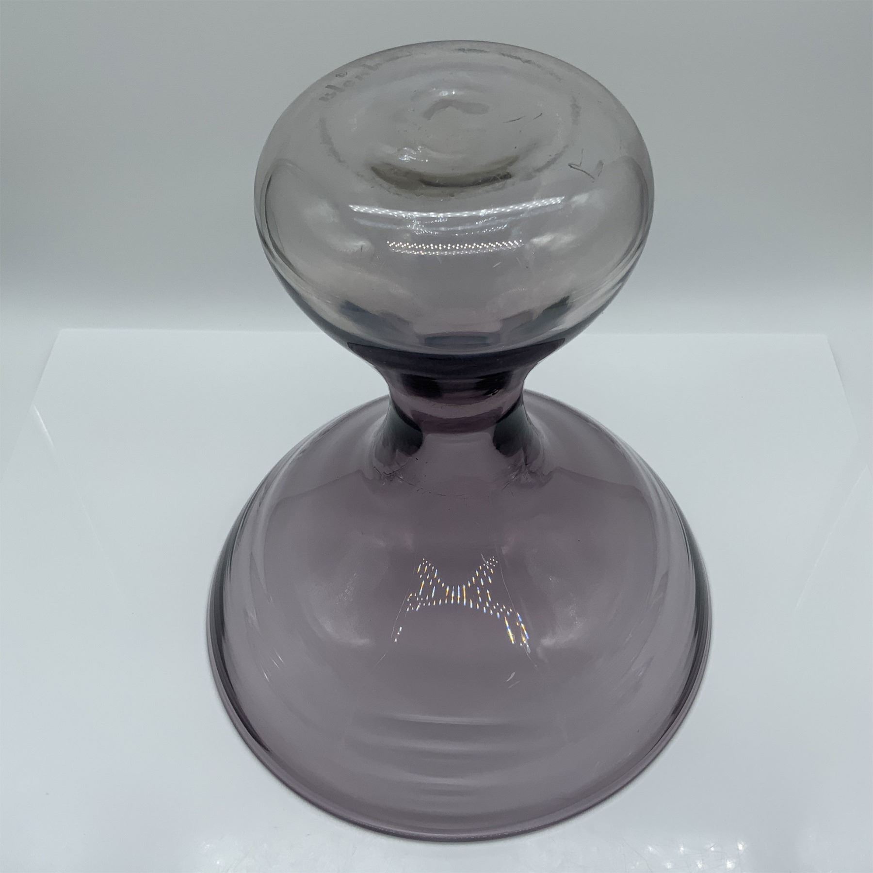 Unique hand-blown purple glass vase crafted by Blenko Glass Company, featuring the distinctive Blenko backstamp. This exquisite vase showcases a distinctive and artistic design, highlighting the craftsmanship and quality for which Blenko is renowned. Standing 10 inches in height, it exhibits a soft purple hue and subtle imperfections characteristic of hand-blown glass, adding to its charm and uniqueness. A beautiful addition to any collection or decorative setting, this vase reflects both functionality and timeless artistry.