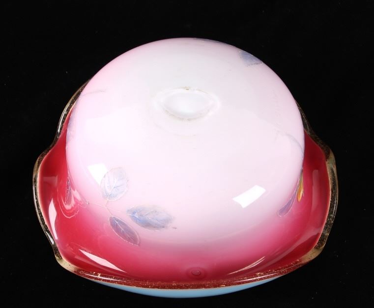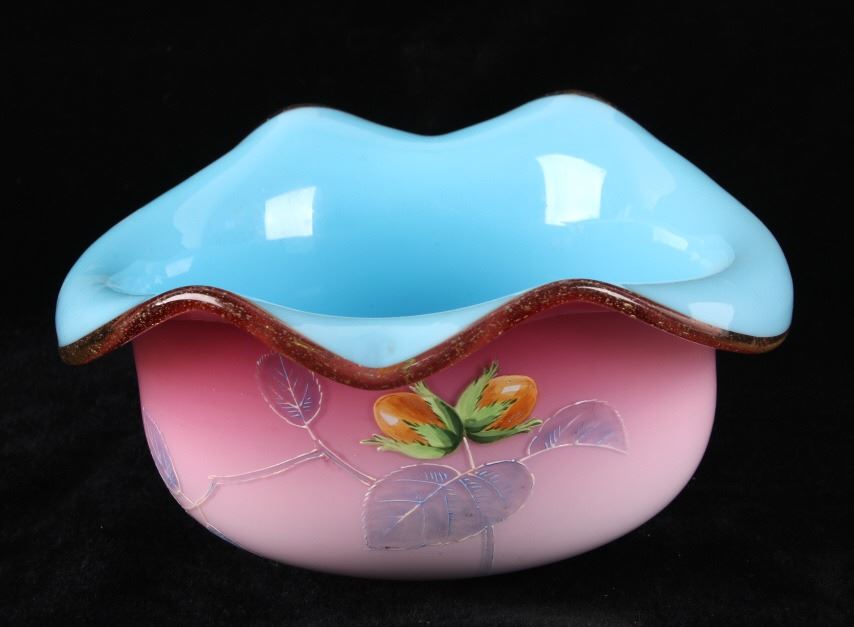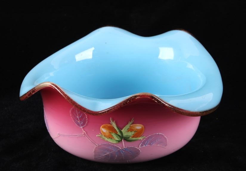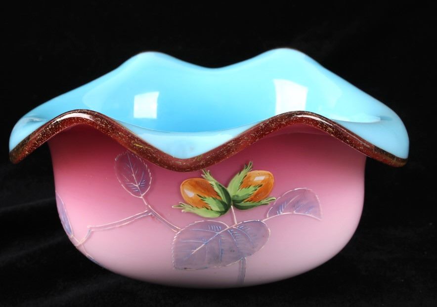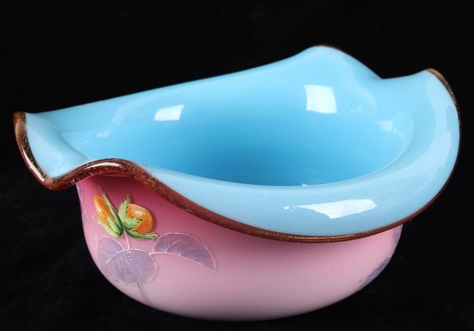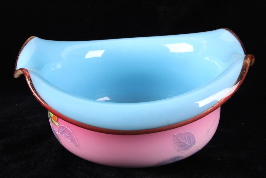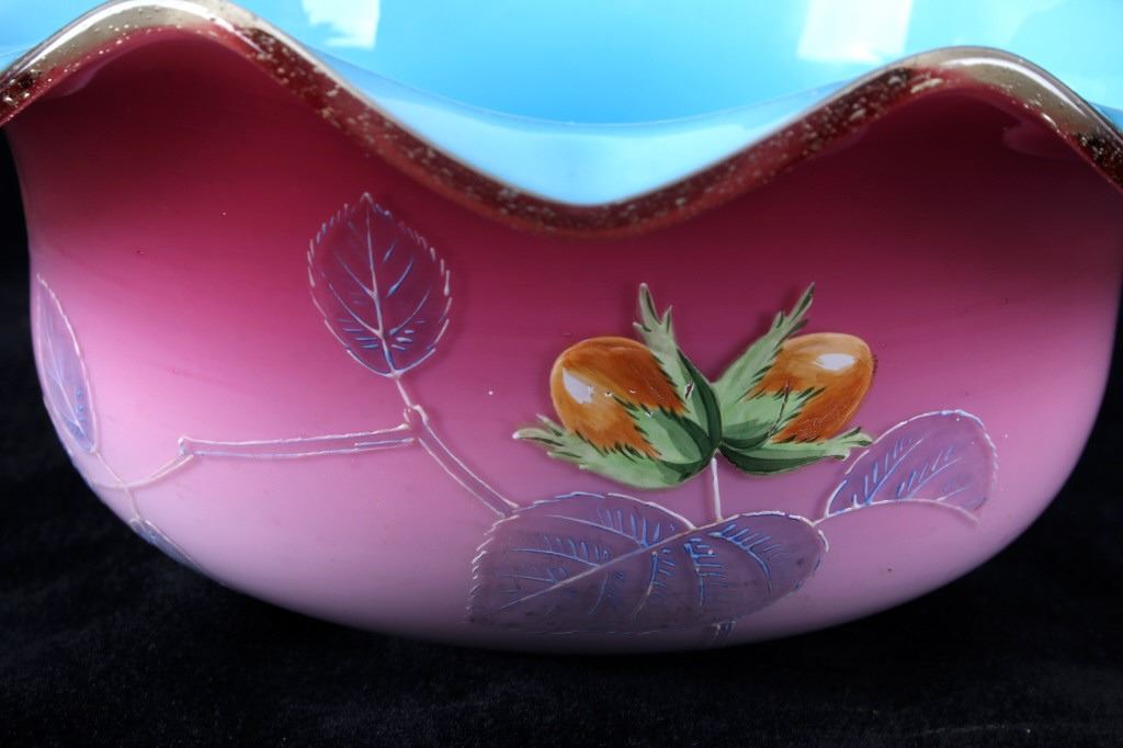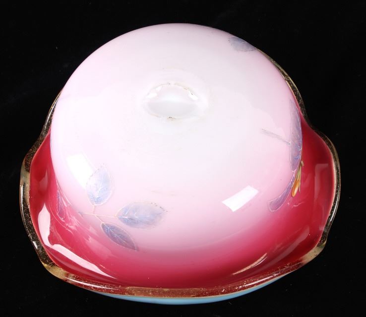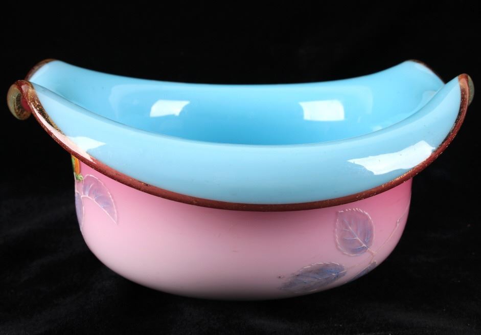 For your consideration is a vintage handblown glass bowl with applied floral design and scalloped edging. The bowl features bright pastel colors and hand painted flowers on the exterior. The bowl is in good condition, showing no scratches or cracks. It measures 8.25" diameter x 3.25" deep.