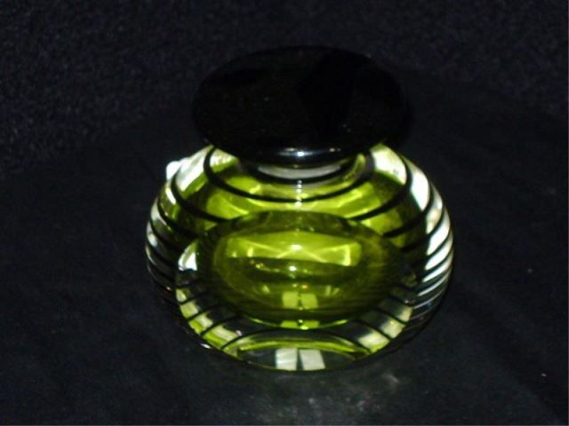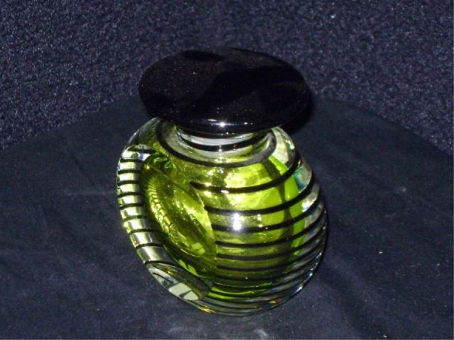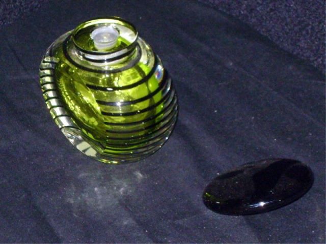 Hand Blown Glass Perfume Flask Black & Yellow w/ Stopper 3 1/2" high x 3 1/2" wide x 1 3/4" deep Rte