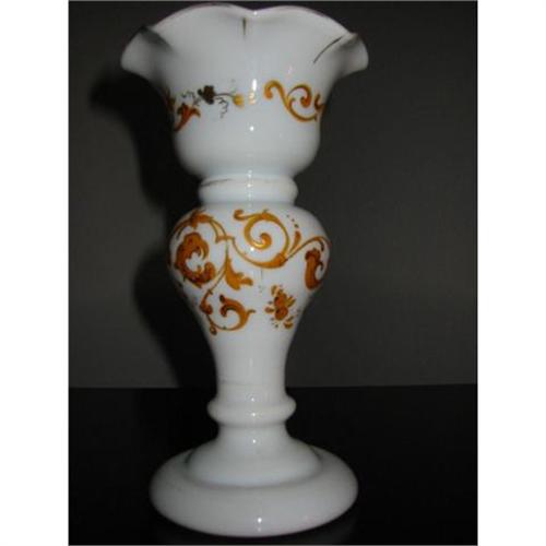 This stunning,gorgeous 8 inch milk glass vase is hand blown and is vintage/antique vase. It is hand painted with gold accented with orange. Numbered on the base indicated "8" in gold. 4.5 inch on the ruffled top, 4 inch in diamdeter. This vase is beautiful, collectible and in excellent condition.