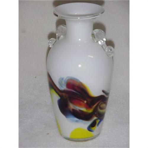 Blown glass vase. 8" tall x 4" in diameter. Clear cased over white multicolored swirl.