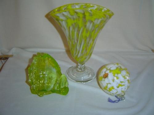 9"H X 7"W X 2.5" Hand Blown Glass Fan Vase and 3.5" Glass Friendship Ball, yellow/white, and a pieces of yellow rock glass.
