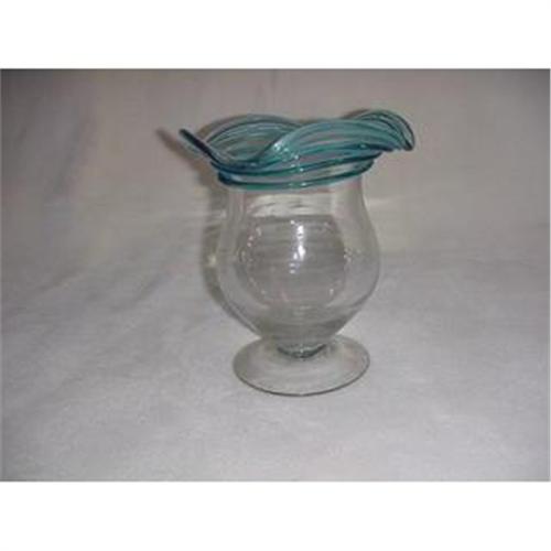 A hand blown glass vase with applied blue ribbing. 8" x 6 1/2" in diameter at top.