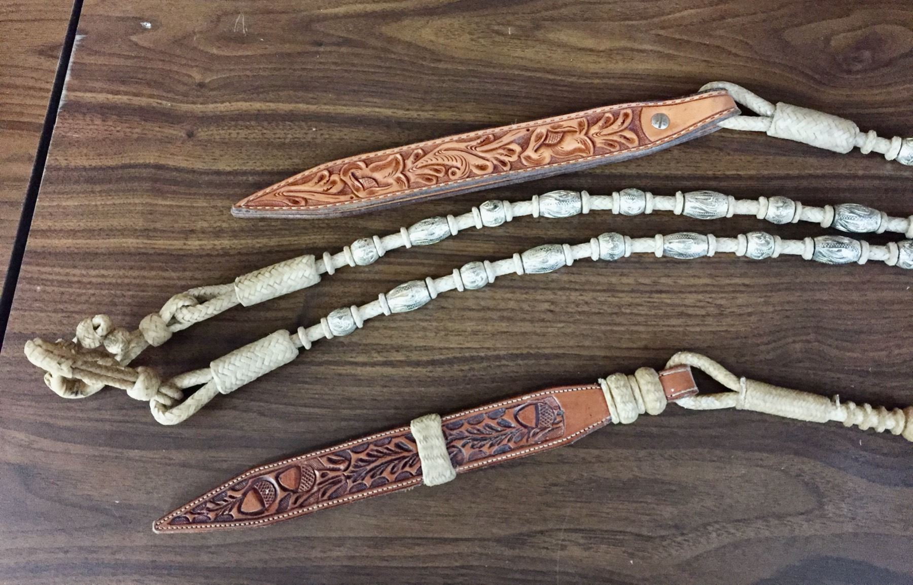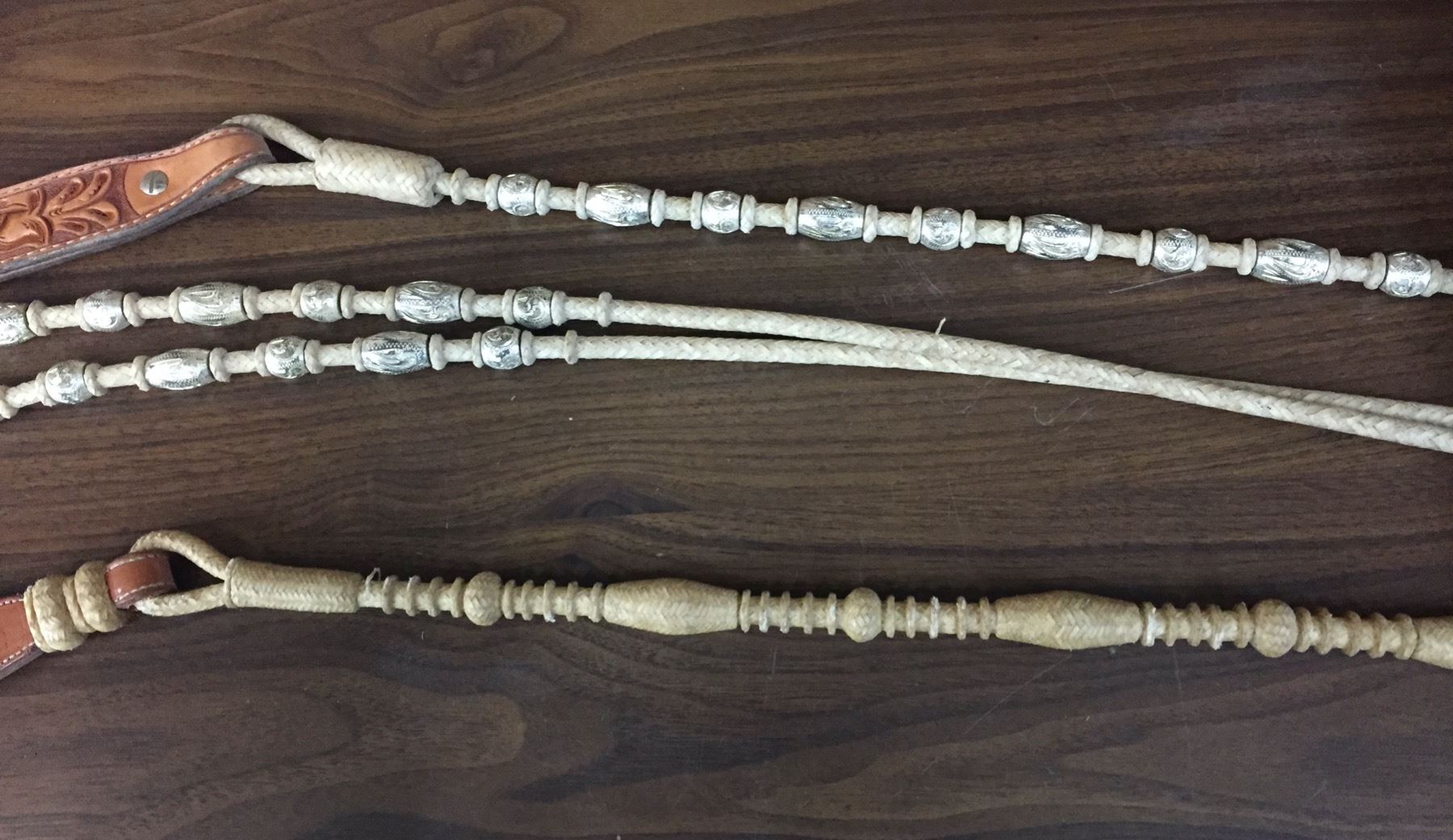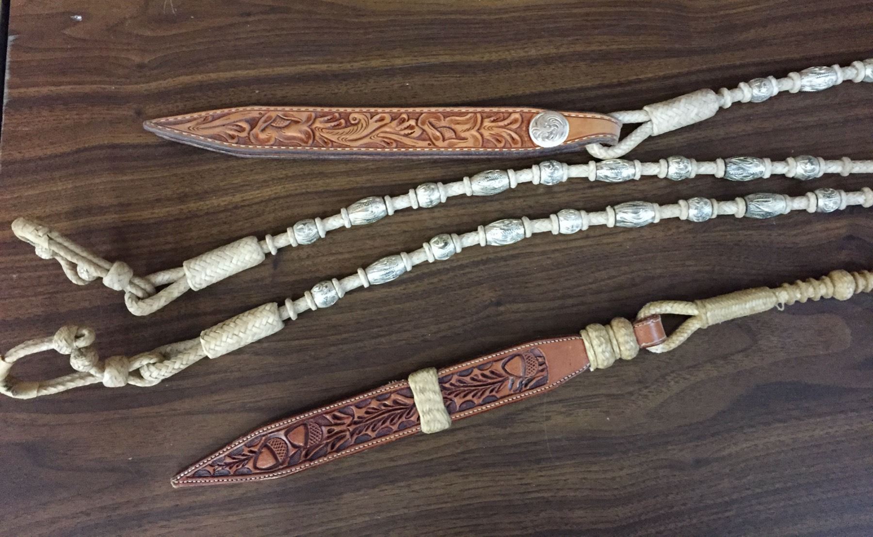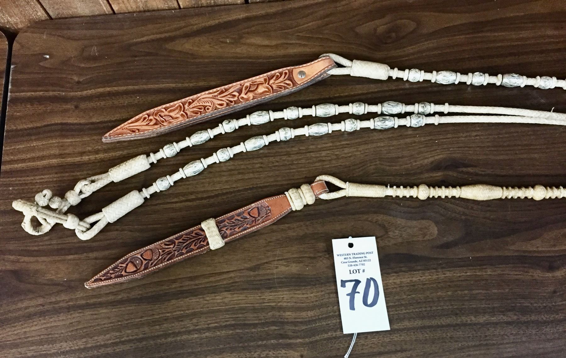 Description: For your collection we offer for sale these hand braided rawhide reins with two romals. One Romal came with these reins and the other is very similar. Maker: Unknown. Approx. Age: Fairly modern. Size: Reins measures 55” long each, romals are about 52” long. Condition: Good. Please look closely at the pictures - they are an important part of our description. Shipping: There will be a $5 handling / packaging fee for shipping this lot. The actual cost of postage will be added on top of that.