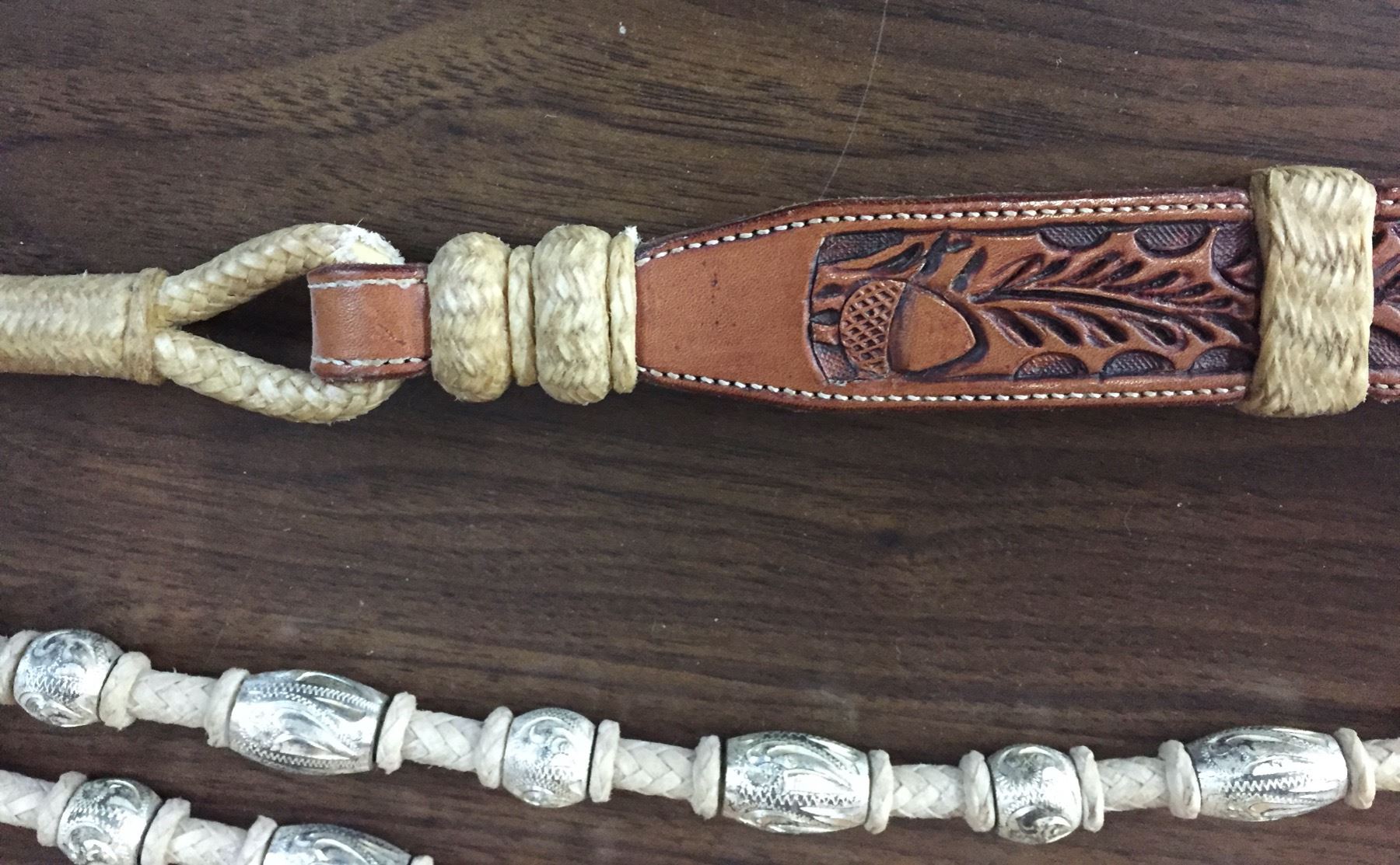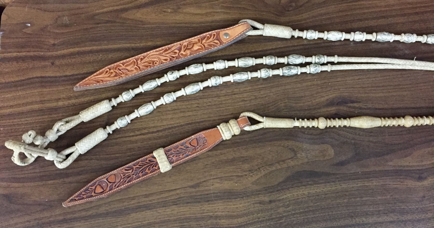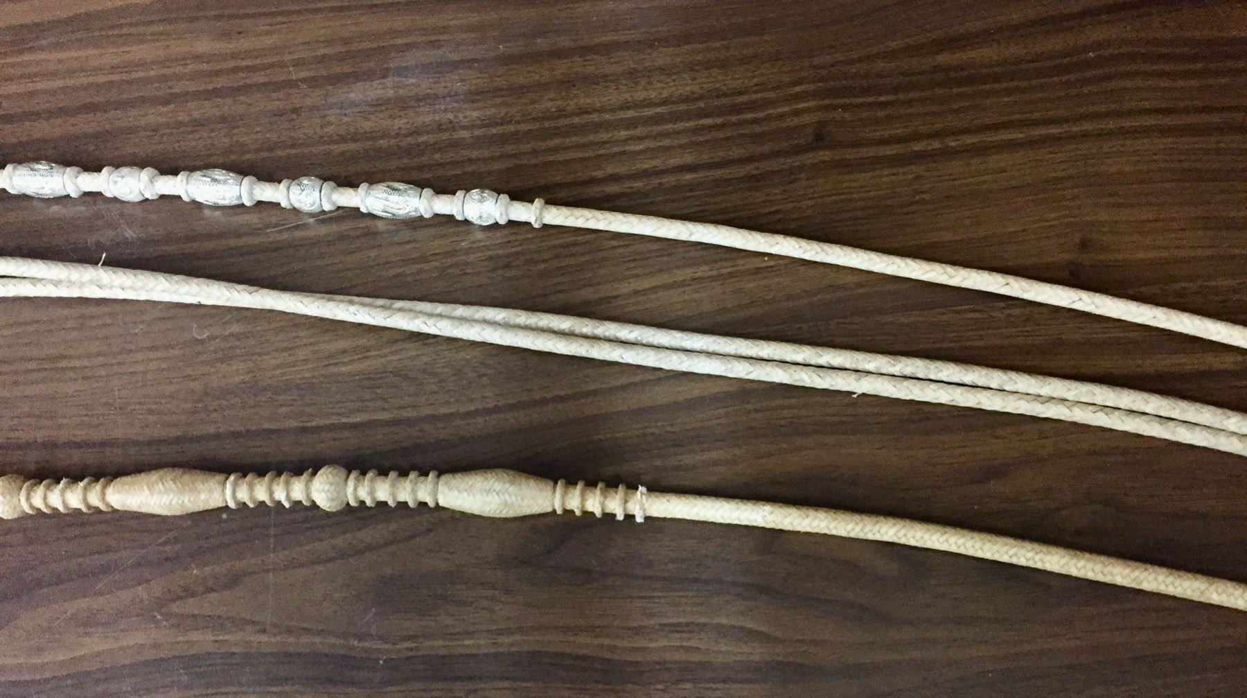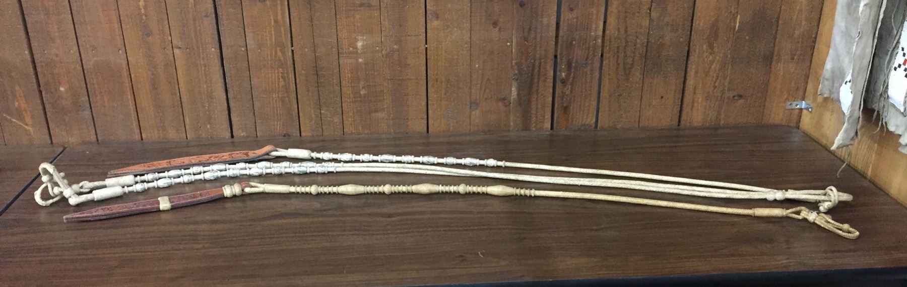 Description: For your collection we offer for sale these hand braided rawhide reins with two romals. One Romal came with these reins and the other is very similar. Maker: Unknown. Approx. Age: Fairly modern. Size: Reins measures 55” long each, romals are about 52” long. Condition: Good. Please look closely at the pictures - they are an important part of our description. Shipping: There will be a $5 handling / packaging fee for shipping this lot. The actual cost of postage will be added on top of that.