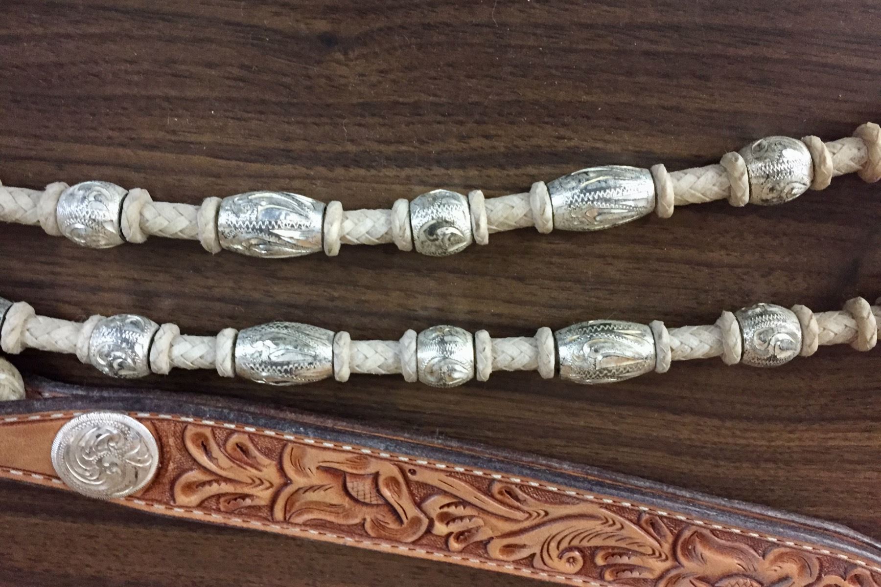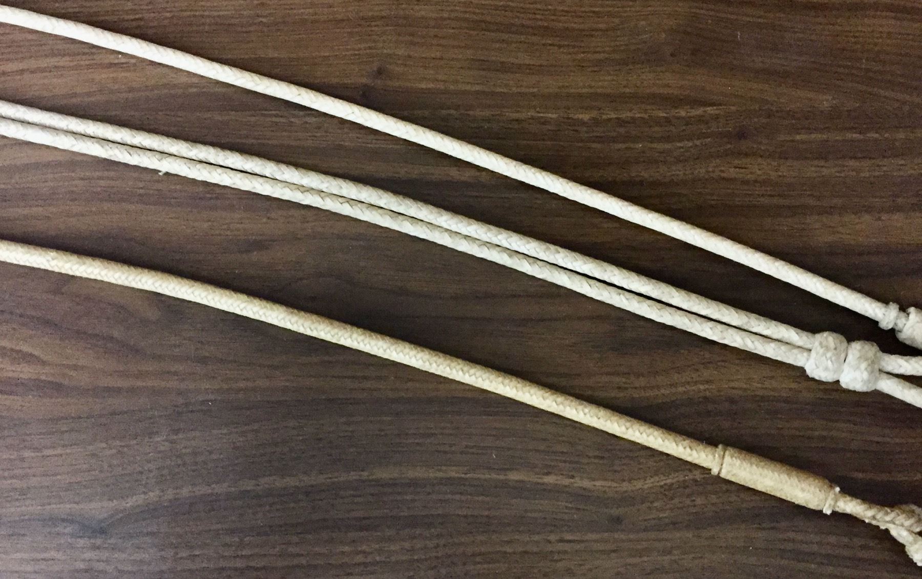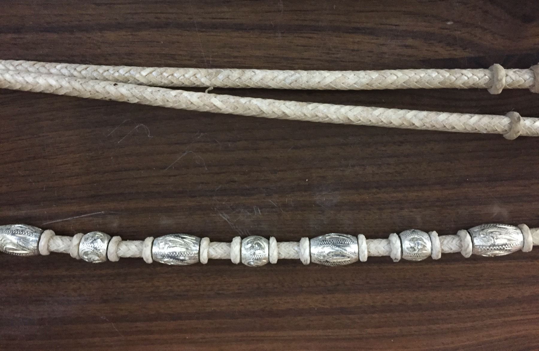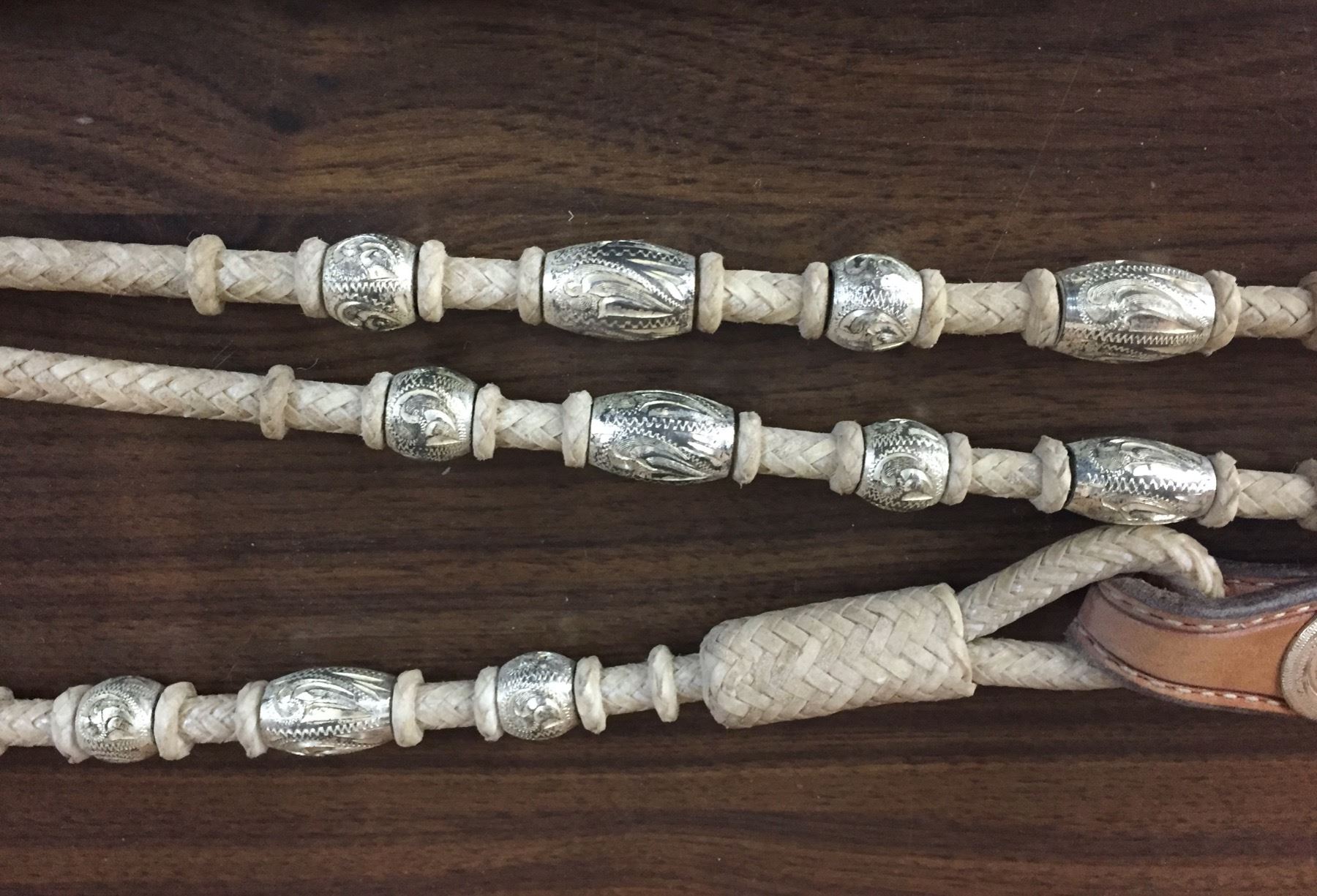 Description: For your collection we offer for sale these hand braided rawhide reins with two romals. One Romal came with these reins and the other is very similar. Maker: Unknown. Approx. Age: Fairly modern. Size: Reins measures 55” long each, romals are about 52” long. Condition: Good. Please look closely at the pictures - they are an important part of our description. Shipping: There will be a $5 handling / packaging fee for shipping this lot. The actual cost of postage will be added on top of that.