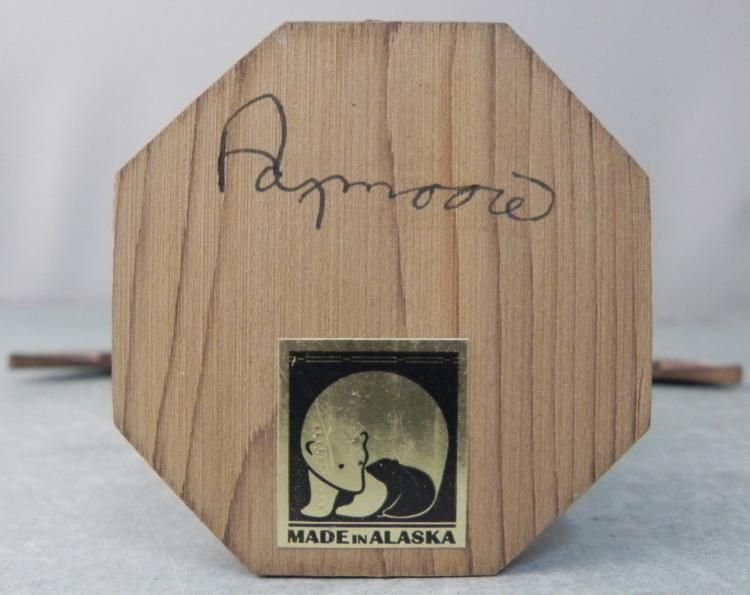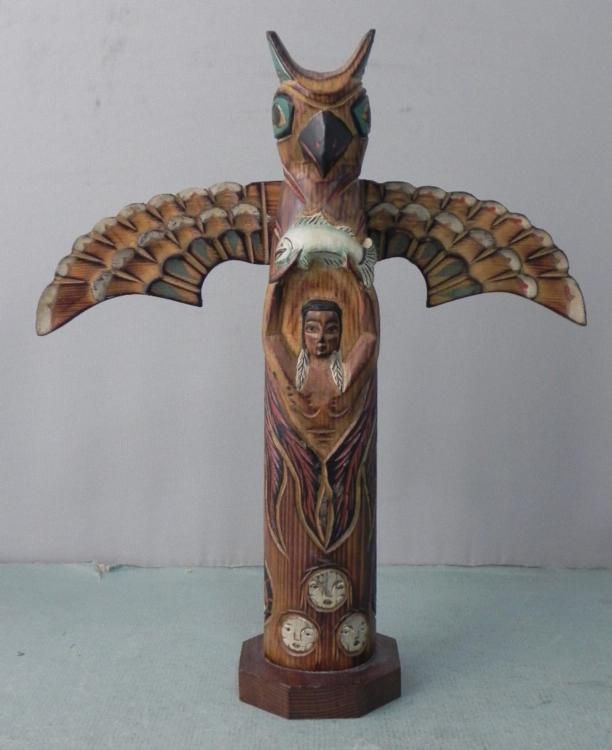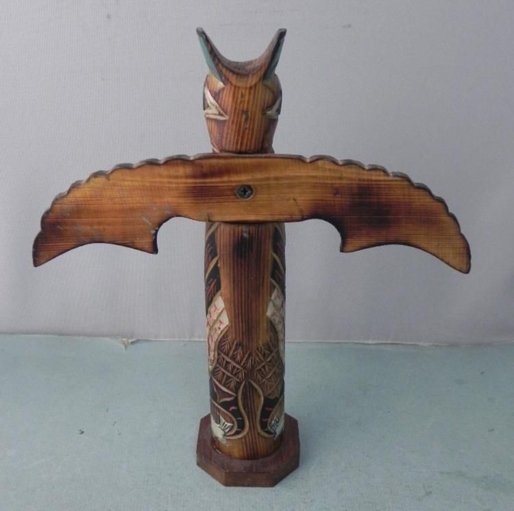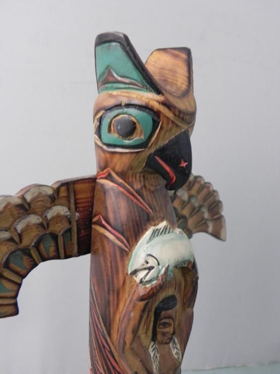 This totem pole is beautifully hand carved in wood by a native Alaskan artist. The name Foxmoore is signed in pencil under the base, along with an Alaska sticker. It has colored details, depicting a great bird of prey catching fish, and a man holding up his own catch to the great spirit. The dimensions are is 10 1/2 and 9 inches. The condition is excellent. * This is a fine totem pole for any display.