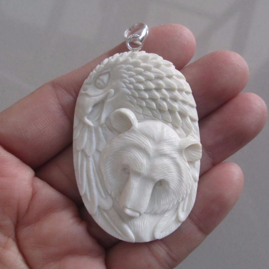Hand Carved Bear & Eagle Pendant,....Size : 53 mm x 36 mm;