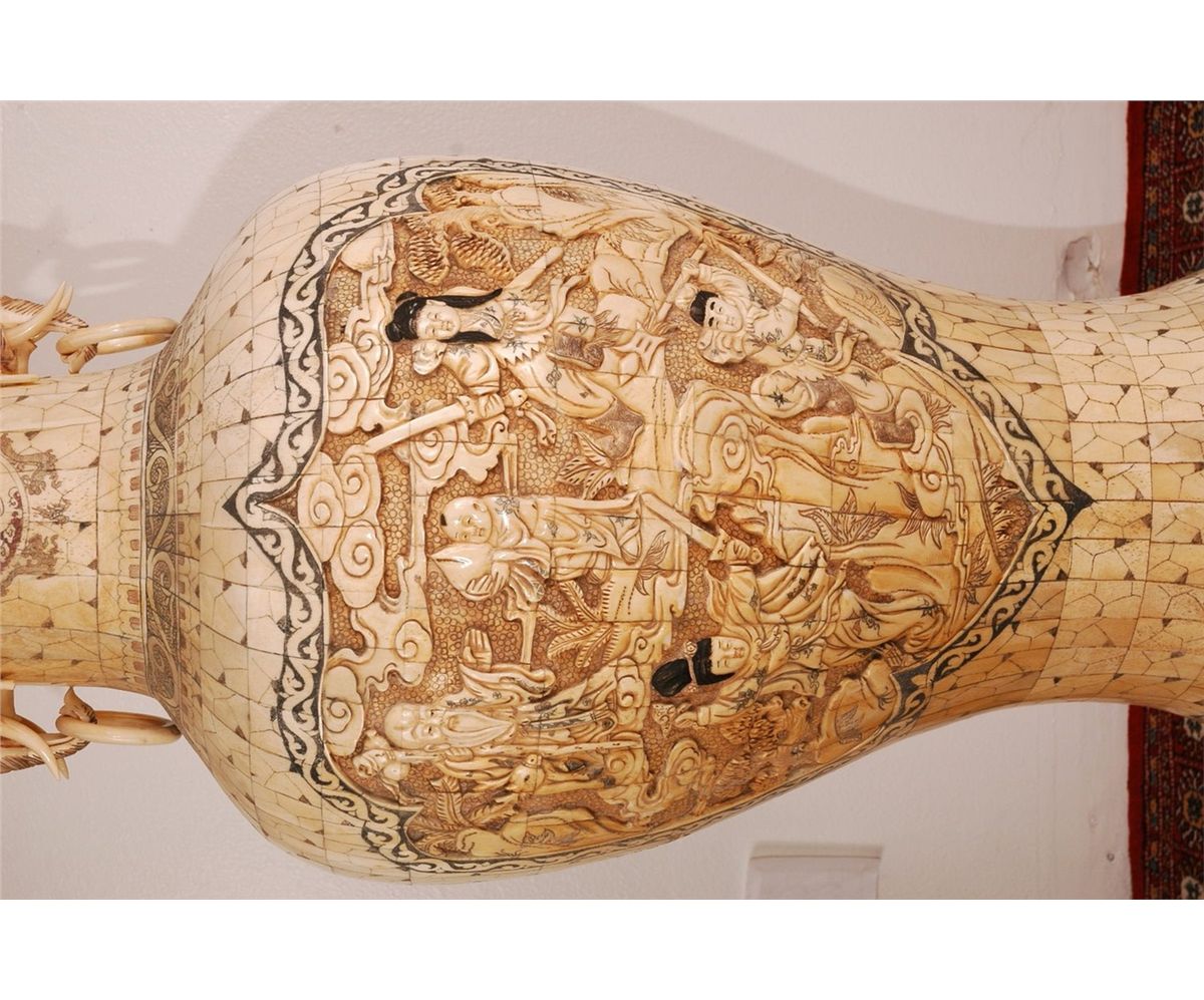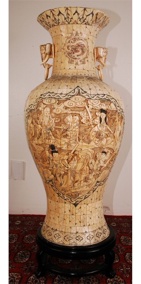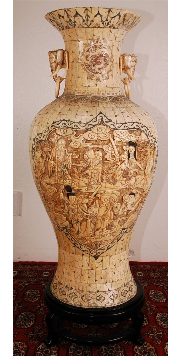 Intricately carved bone vase with asian design. Handles carved into elephant heads on both sides with ring in its trunk. Exquisite! 20" Diameter.