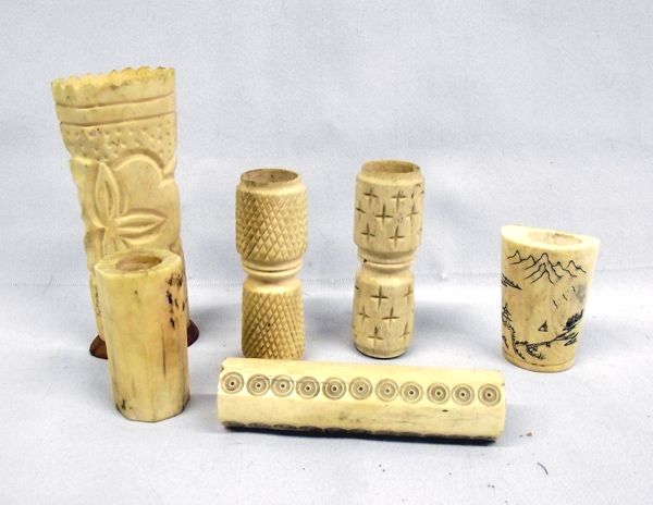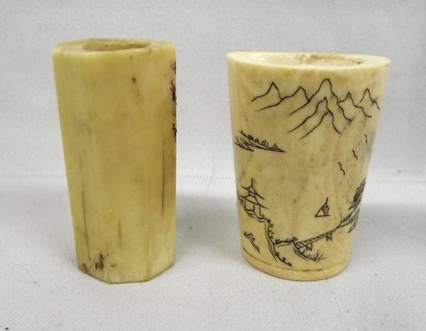 Hand Carved Bones, largest measures 4.25''H x 2''W, various designs and shapes, one has a Russian tag on the bottom of it