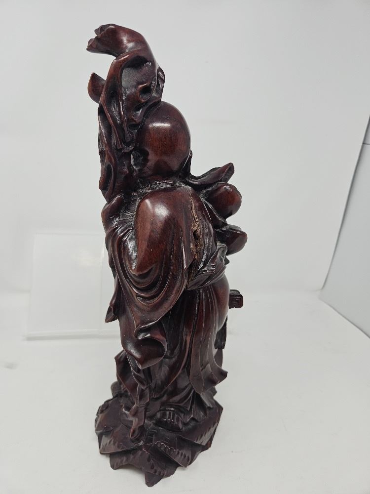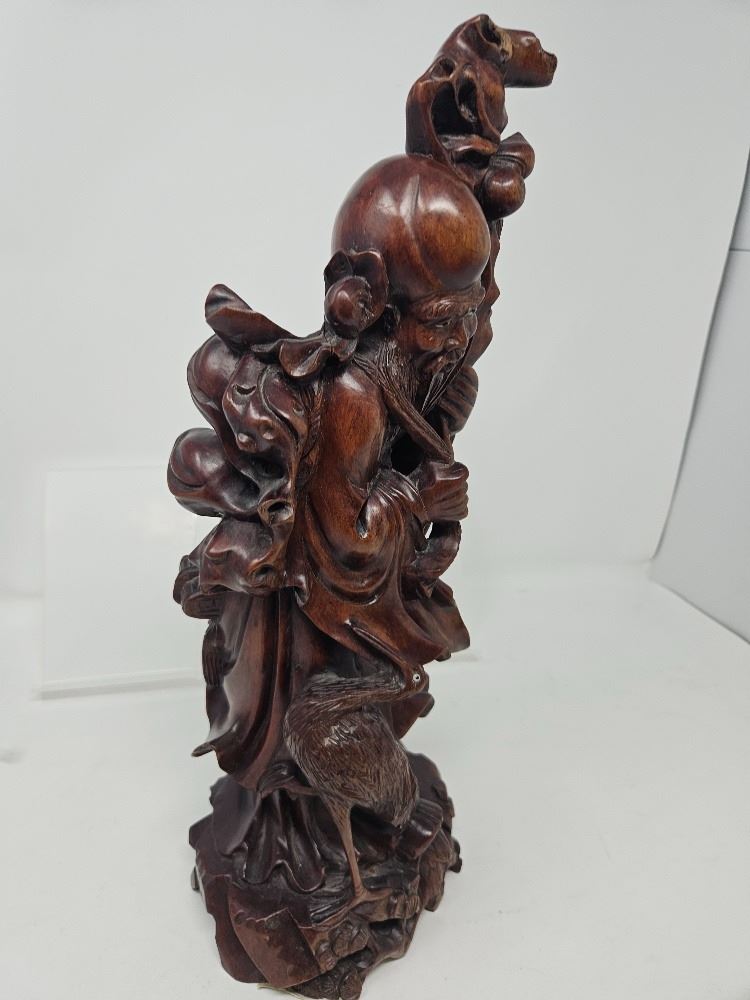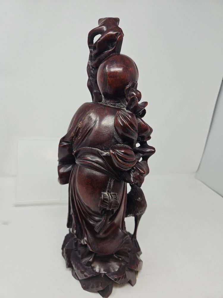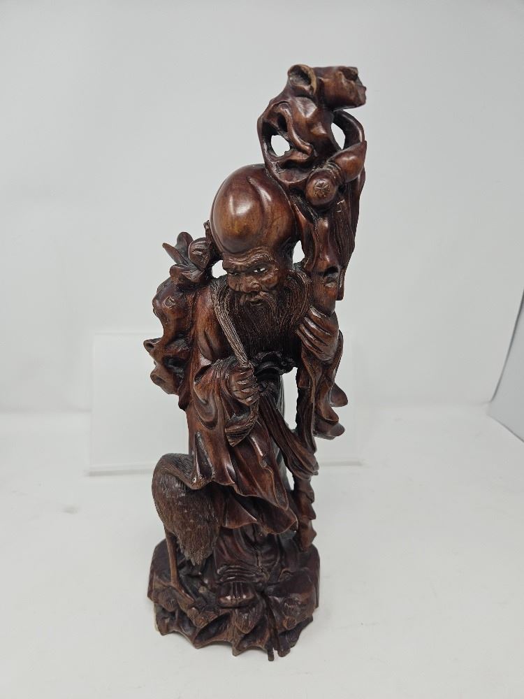 Intricately carved wood figure of a Chinese immortal with staff, deer, and flowing robes. Excellent craftsmanship and spiritual symbolism—classic cultural decor piece.