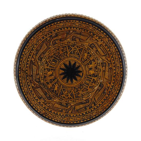 Excellent hand carved piece, compass rose and zodiac motif, 5"