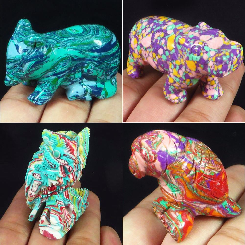 1. Mouse ------- Gem Type:Rainbow Calsilica;Weight:221.9CT;Shape:Mouse;Size:51x31x19mm;Origin:USASpecific Gravity:-Color:As PicturePurpose:Collection, Gift.2. Hippo ----- Gem Type:Colorful Turquoise;Weight:160.8CT;Shape:Hippo; Size:51x30x20mm;-Origin:USA;-Color:As Picture Purpose:Collection, Gift.3. Owl --- Gem Type:Rainbow Calsilica;Weight:236.5CT;Shape:Owl;Size:53x29x28mm;-Origin:USA;Specific Gravity:-Color:As PicturePurpose:Collection, Gift.4. Parrot ---- Gem Type:Rainbow Calsilica;Weight:177.6CT;Shape:Parrot;Size:52x30.5x23mm;-Origin:USA;-Color:As PicturePurpose:Collection, Gift.