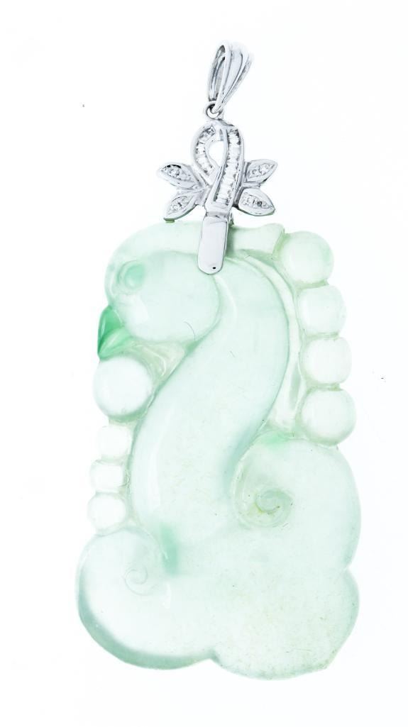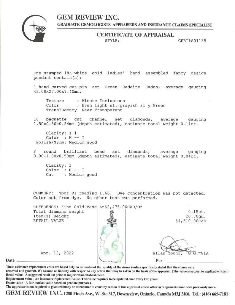 Hand Carved Cut Pin Set Green Jadeite Jade Pendant, w 24 Diamonds, Appraisal:$4510.00