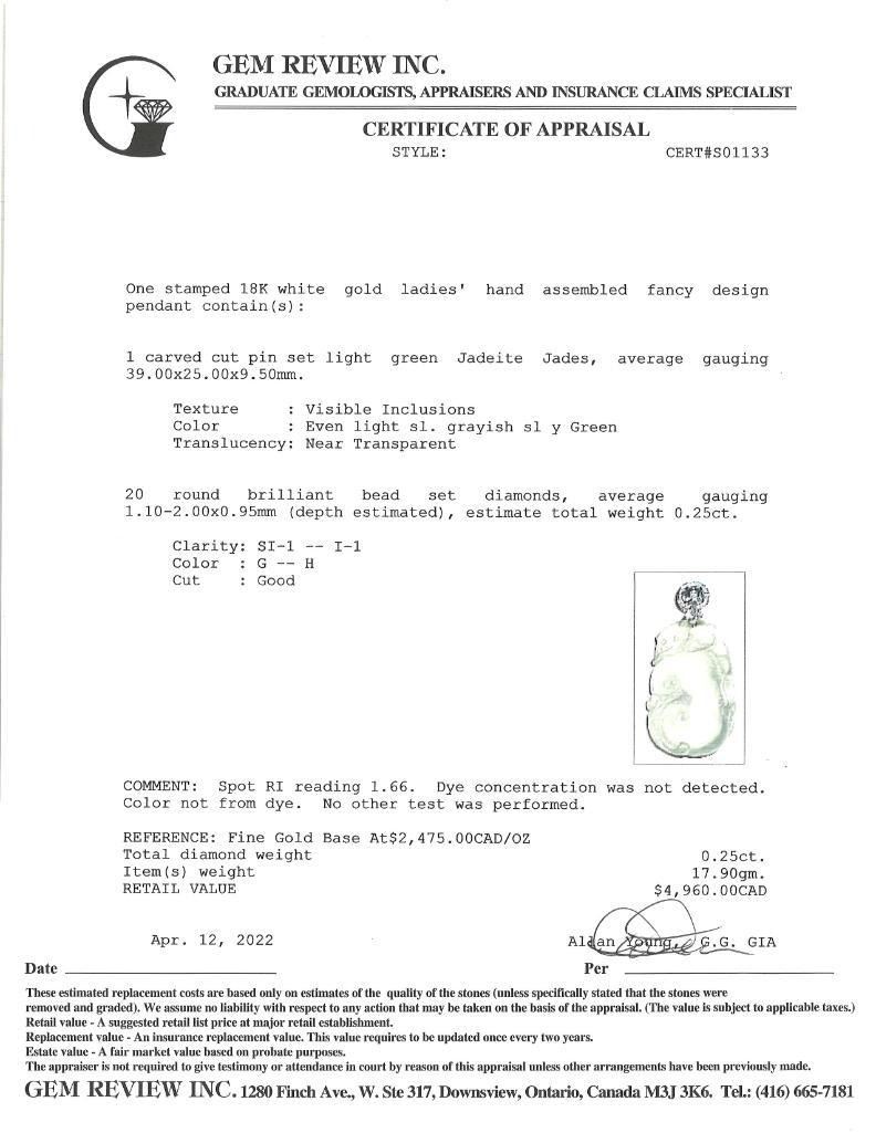 Hand Carved Cut Pin Set Light Green Jadeite Jade Pendant, w/20 Diamonds Set in 18kt Gold Bale. .25ct -Appraisal :$4960.00