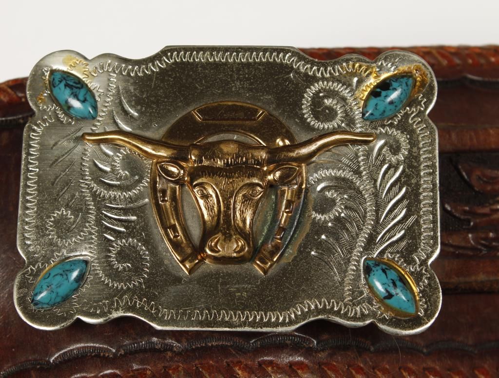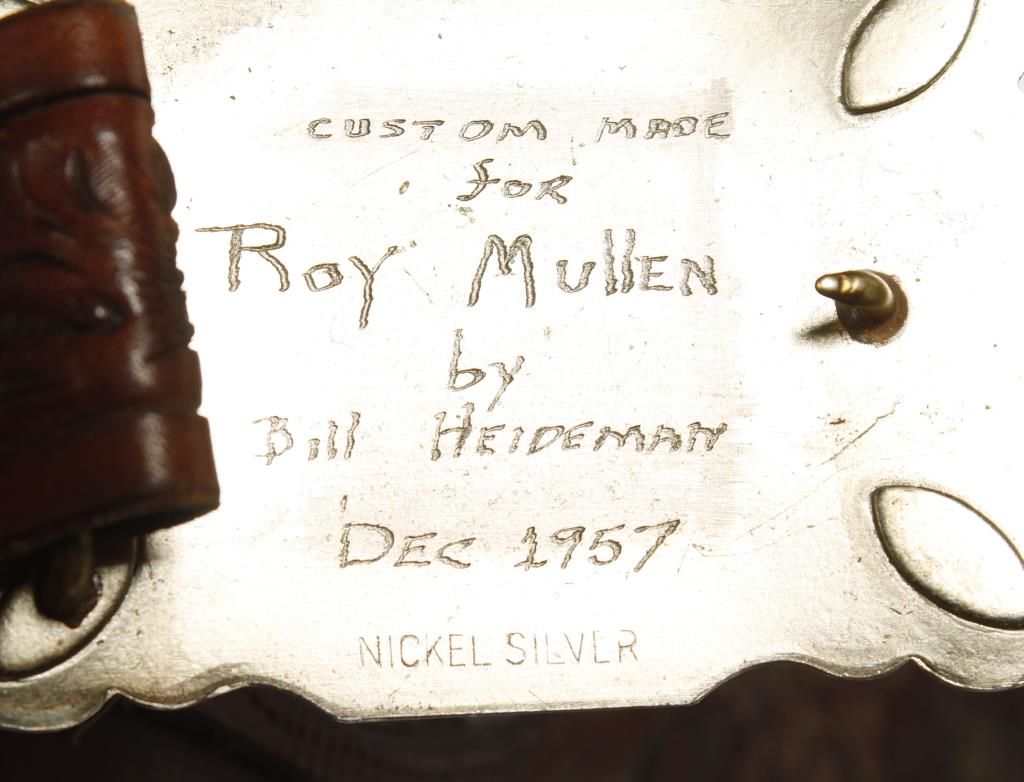 Floral design with steers head nickel buckle. Buckle is marked "Custom made for Roy Mullen by Bill Heideman Dec 1957". Approx 42" long. In overall fair condition.