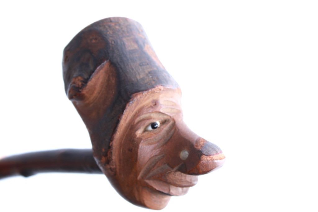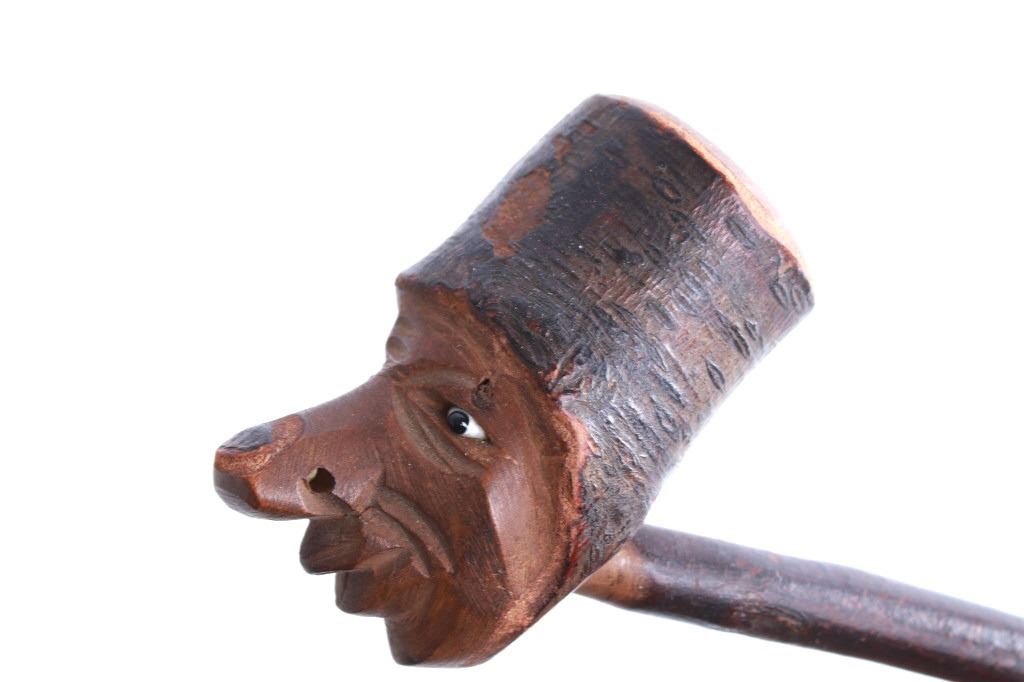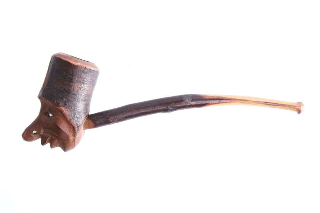Featured in this lot is this hand carved forest spirit willow branch pipe. The pipe shows a professionally and hand carved forest spirit with bead eyes; it is constructed form a willow branch. The condition of this pipe is good, with no obvious signs of damage. The measurements of this pipe are 4" x 6 1/4" x 1 1/2".