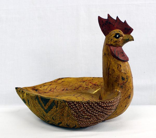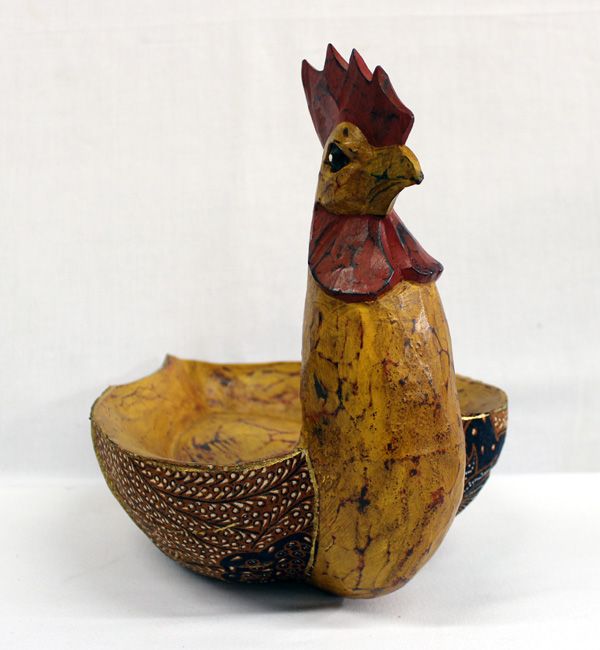 Hand Carved Hand Painted Rooster Bowl. Painted embellishment is in a Batik fabric inspired design. This Piece is approx. 13''L x 8''W.
