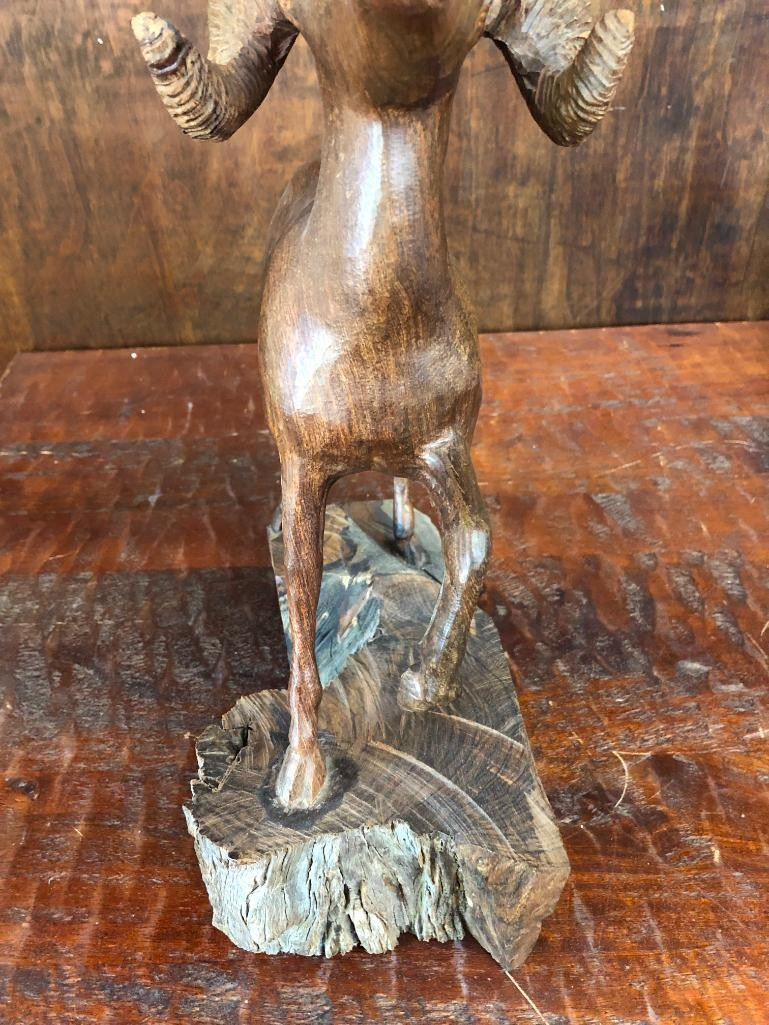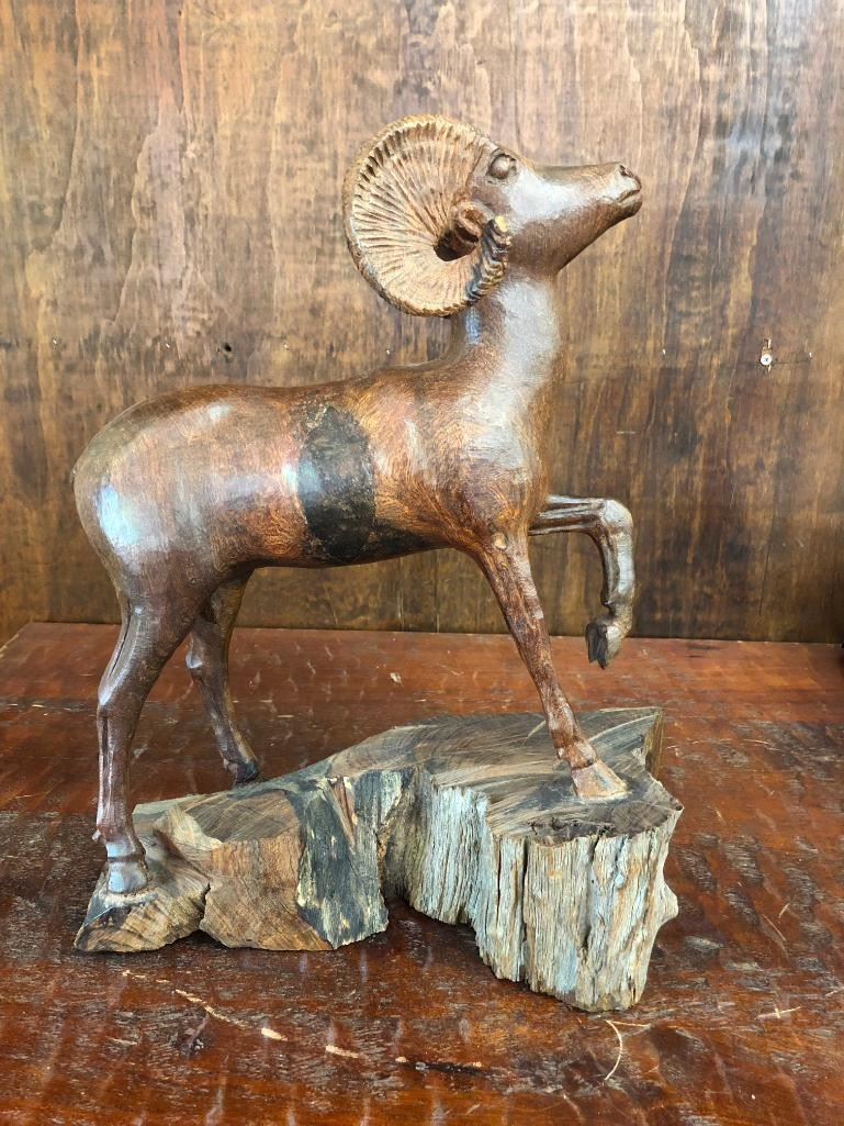 Presented for sale in this lot is a hand carved, highly detailed ironwood statue of a ram. This item would look great displayed on your mantel or elsewhere in the home or office. Maker: Unmarked. Approx. Age: Modern. Size: 16 inches tall X 11 inches wide. Condition: Good for its age, minimal wear expected. Please look closely at the pictures - they are an important part of our description. Shipping: There will be a $15 handling / packaging fee for shipping this lot. The actual cost of postage will be added on top of that. BUY IT NOW: If you would like to buy this item now without waiting for the auction to end (this option is only available up to 48 hours before the auction starts to close), the “Buy it Now” price is the high estimate of this lot. If you would like to end the auction early and pay the high estimate (plus applicable fees), please contact us by phone or email and reference this lot number.