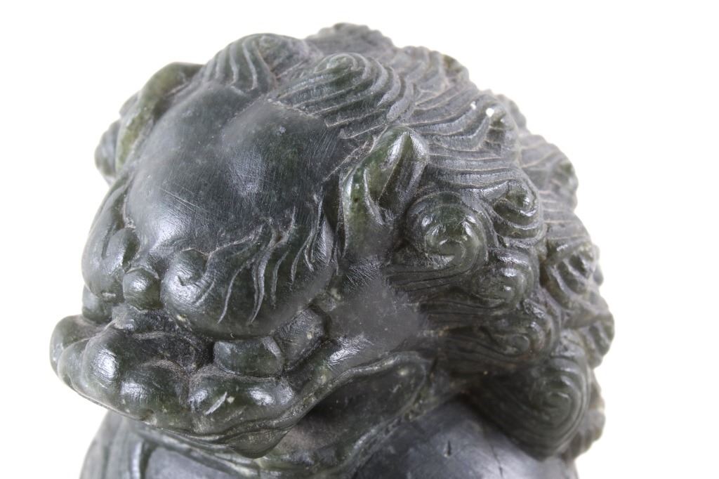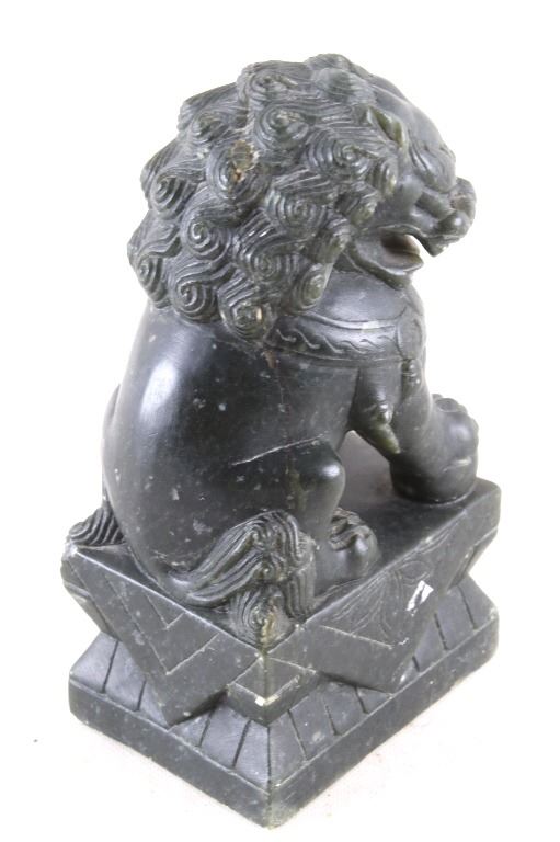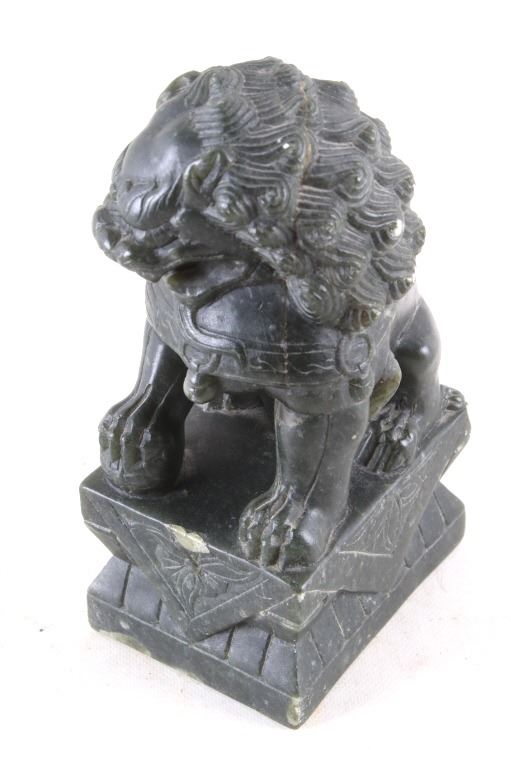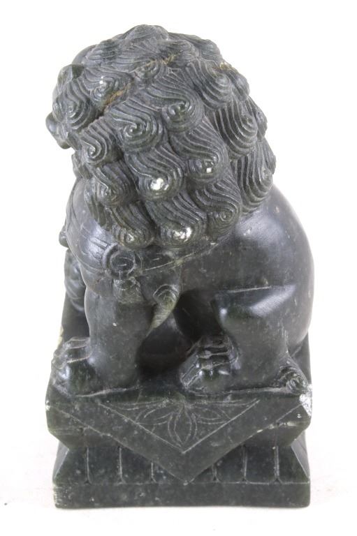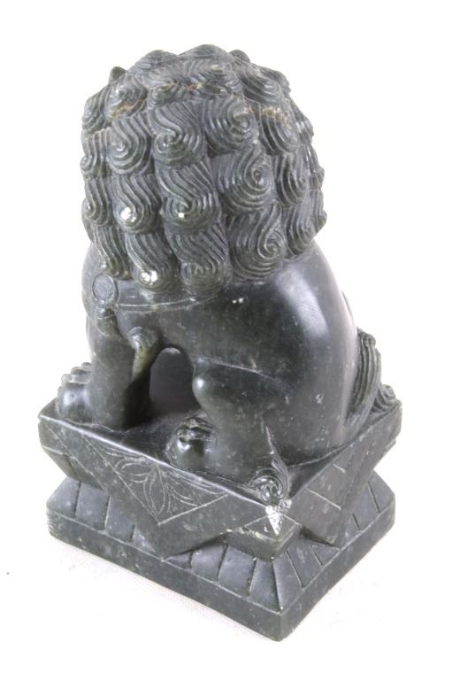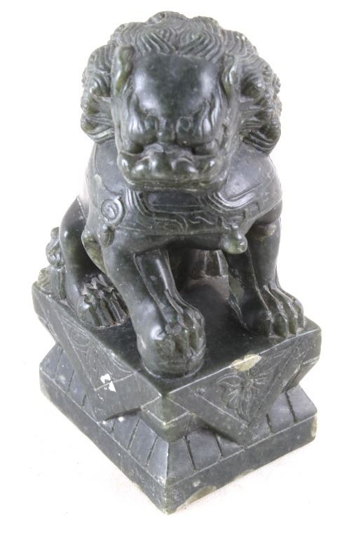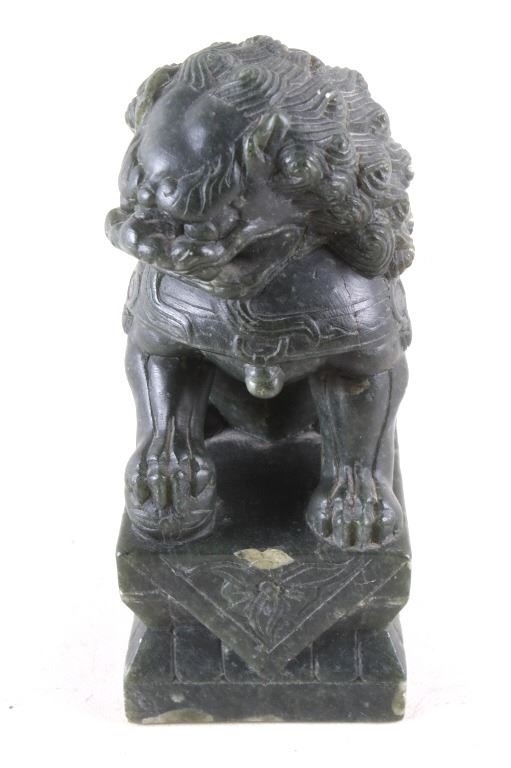 For your consideration is this mid century hand carved Jadeite Foo Dog, Fu dog, or Lion Dog statue. The Foo Dog is a deep forest green Jadeite construction; with wonderful craftsmanship with good attention to detail. The Fu Dog or Chinese guardian lions are a traditional Chinese architectural ornament traditionally used in tombs and Imperial Palaces. The Foo Dog is in good condition and would display well. The measurements of this Foo Dog are 6" x 2 1/2" x 3 1/4".