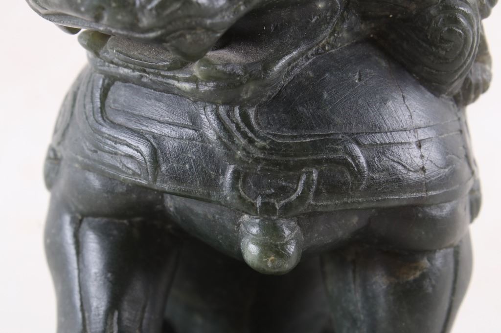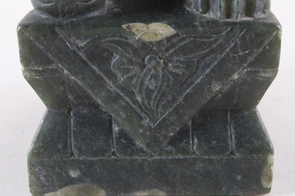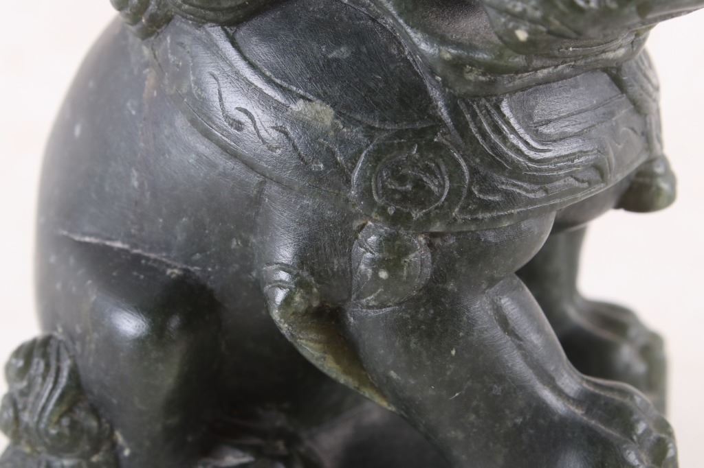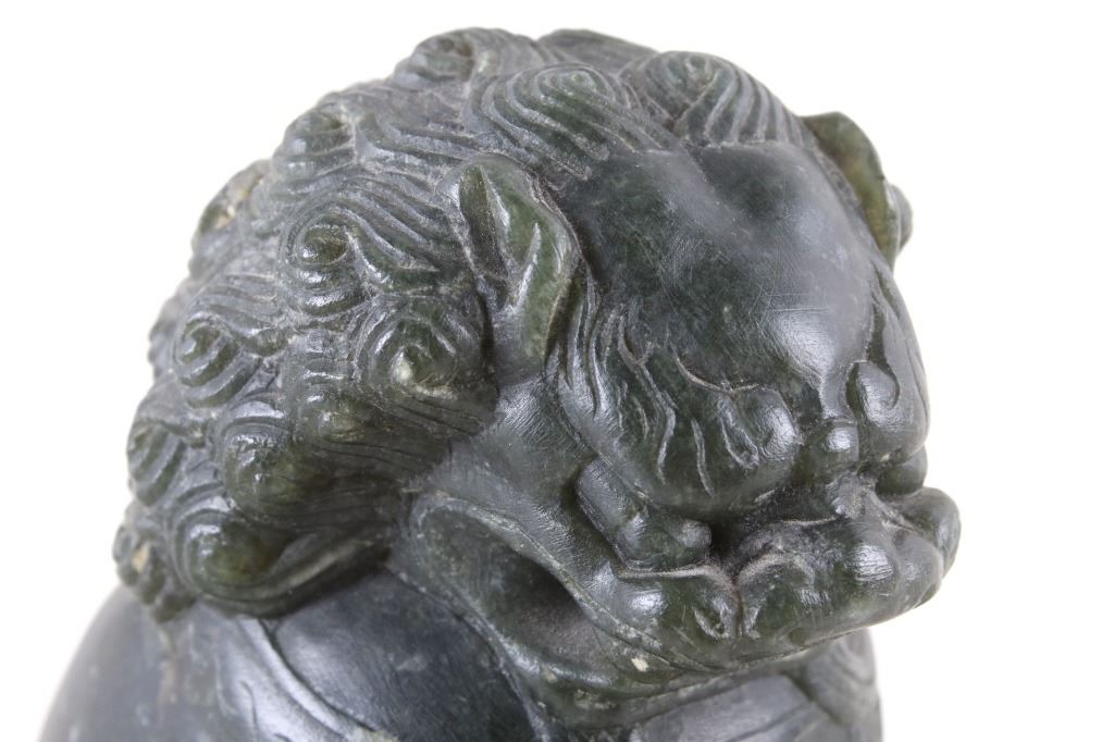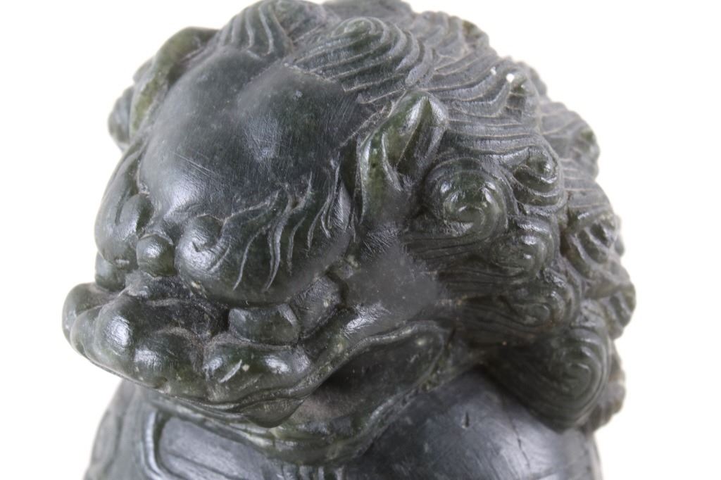 For your consideration is this mid century hand carved Jadeite Foo Dog, Fu dog, or Lion Dog statue. The Foo Dog is a deep forest green Jadeite construction; with wonderful craftsmanship with good attention to detail. The Fu Dog or Chinese guardian lions are a traditional Chinese architectural ornament traditionally used in tombs and Imperial Palaces. The Foo Dog is in good condition and would display well. The measurements of this Foo Dog are 6" x 2 1/2" x 3 1/4".