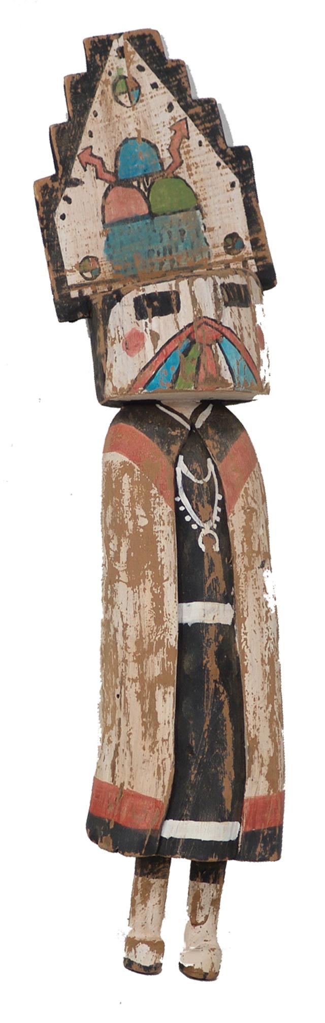 Mid/Late 1900s, Large hand carved and hand painted cottonwood root doll with a full tableta headdress. 21"