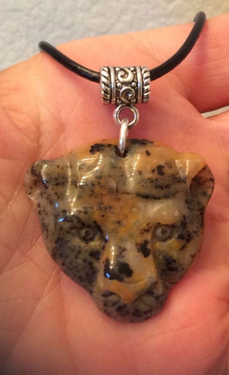Hand Carved Leopard Petrified Wood Opal Pendant...........size 34 x 35 x 7 mm; adjusts from 18" up to 20"long ;