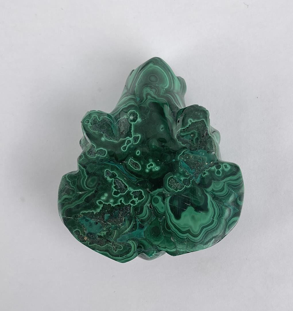 3" long, 2.25" wide. Hand carved and polished from natural Malachite. The Greeks often associated Malachite with the Goddess Venus. Malachite cut into a triangular shape was believed to provide the bearer with protection against the Evil Eye and draws love to the bearer. Malachite brings harmony into one`s life. So, it can also be called as this stone is useful for meditations. Malachite was believed to offer protection to children from evil spirits and witches. It may bring prosperity to the wearer. Sometimes it is called as the businessman`s Stone. Malachite releases negative and painful emotions by absorbing them. It clears the path to your desired goal. It is the stone of transformation. Malachite brings fidelity in love and friendship. Gem therapists use malachite to relax an over-taxed nervous system. It brings tolerance, flexibility, patience and stabilizing influence.