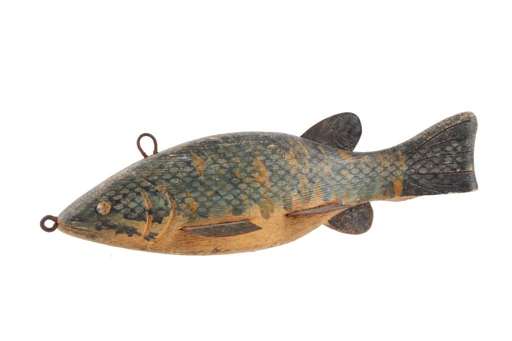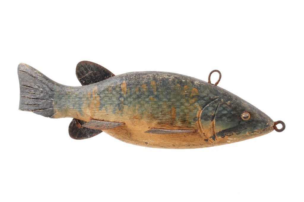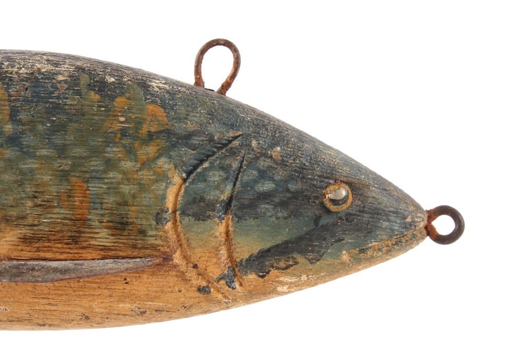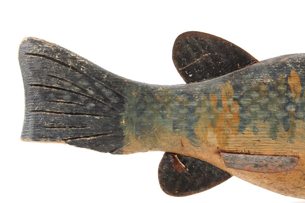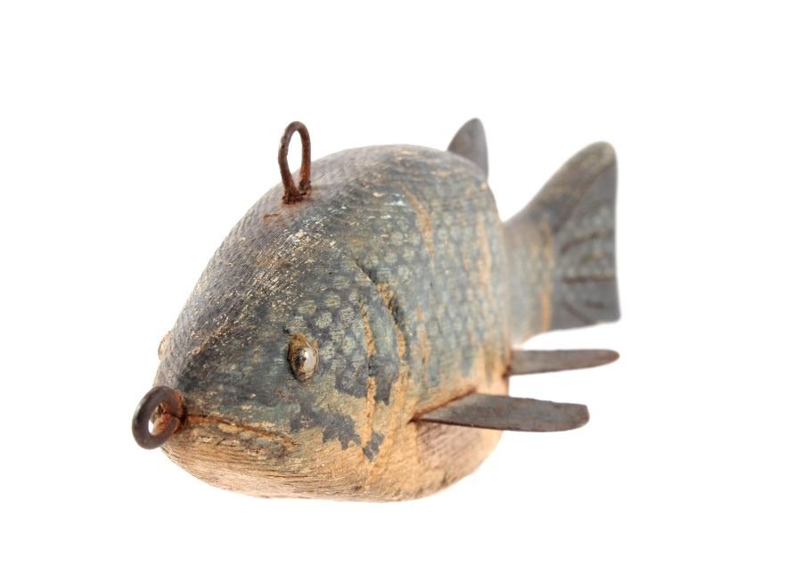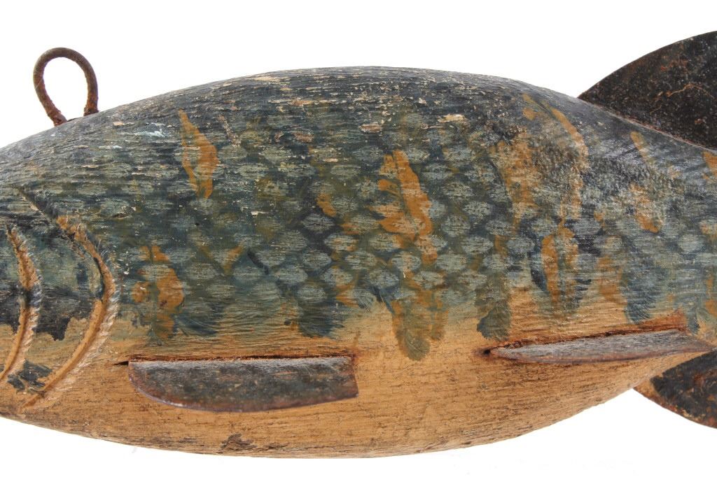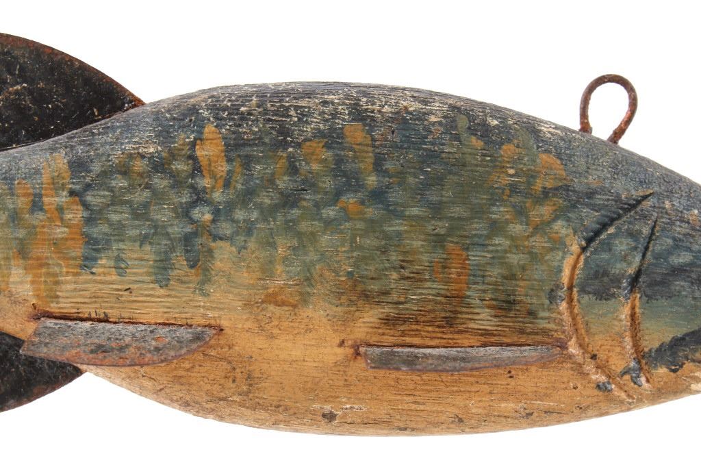 For your consideration hand carved and painted fishing spear decoy circa early 1900's. The fishing spear shows hand painted construction and hand carved construction with good coloration and decoration to the fishing decoy. The condition of this fishing spear is good with very little wear tot he paint on the decoy with some oxidation to the iron rings on the top and front of the fishing spear with a slight chip to the bottom of the tail of the fish.