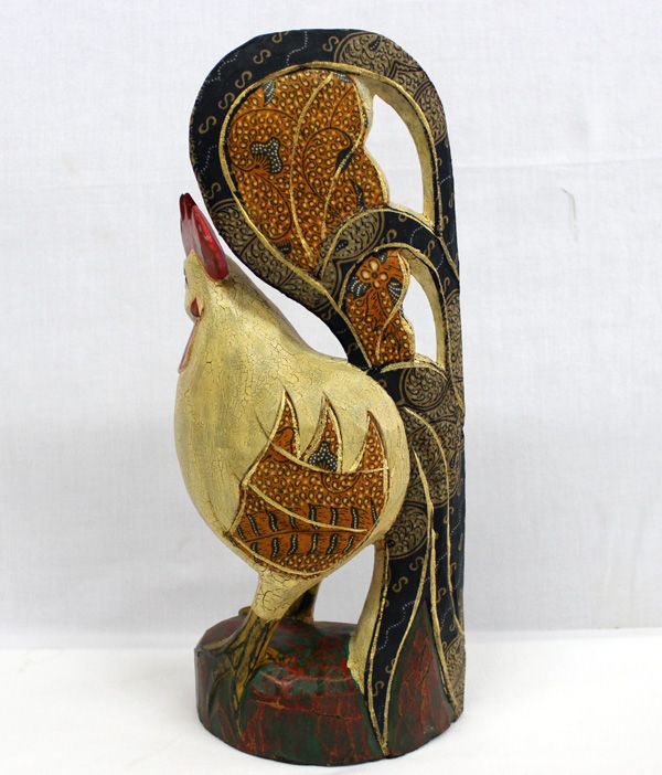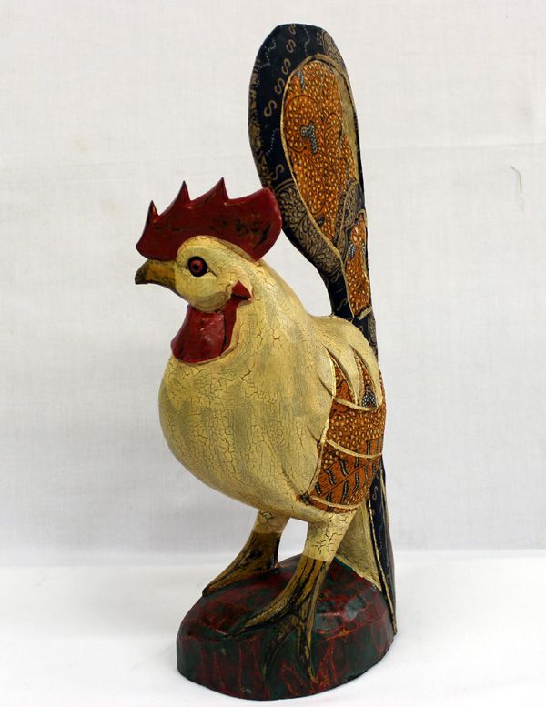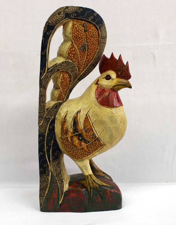 Hand Carved & Painted Rooster Statue, Adorned with a beautiful Batik fabric inspired designs. Rooster stands approx. 15.5''H and is 7''L x 2.5''W.