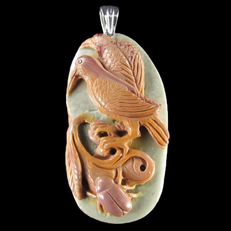 This is a hand carved Bird Pendant *Stone Name - Succor Creek Jasper *Overall Dimension 76x36x11 mm (2.992x1.417x0.433 inch )mm *Weight 180 ct/ 36 g/ 1.269864 oz *Mohs Hardness 7 *Source Natural *Treatments None *Drilled YES diameter 2.5/36-3/36 inch *Other Names Unknown*This Bird bead is handcarved out of one piece of gemstone Succor Creek Jasper .The creative design of each item is based on the stone's natural color and pattern and it demands great craftmenship and patience to complete . This beauty is absolutely a unique center piece for your jewelry design. .~~~~~~~~~
