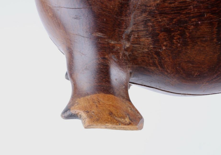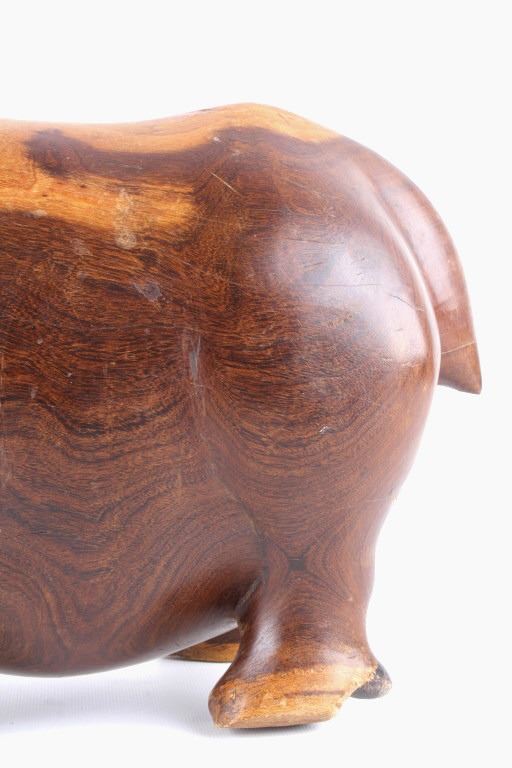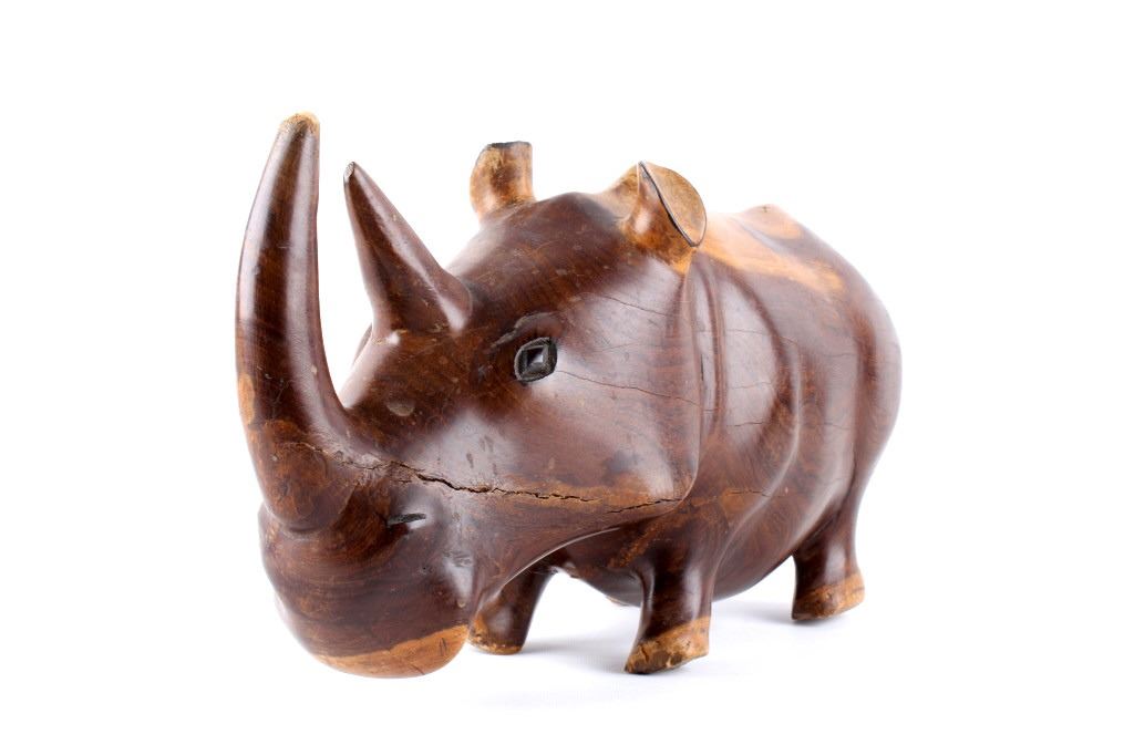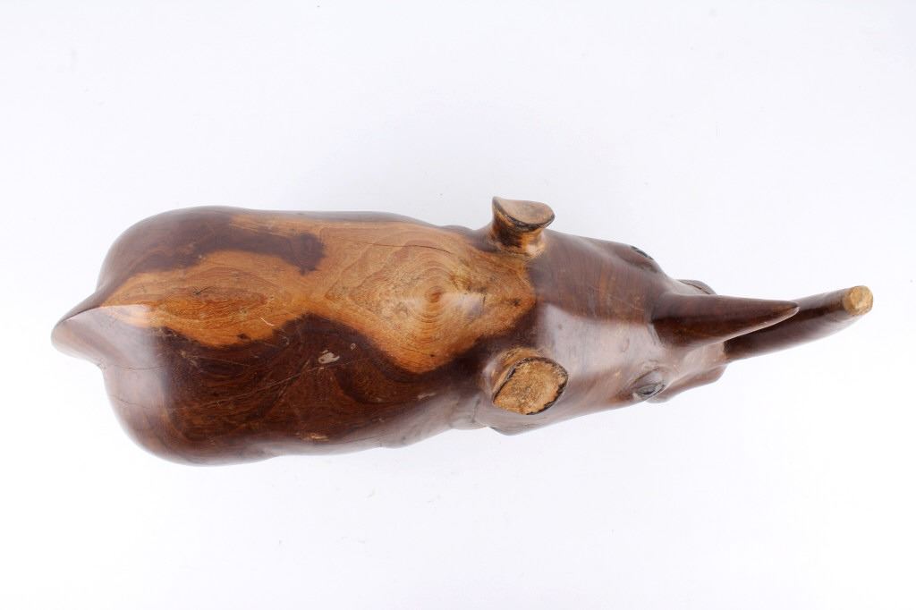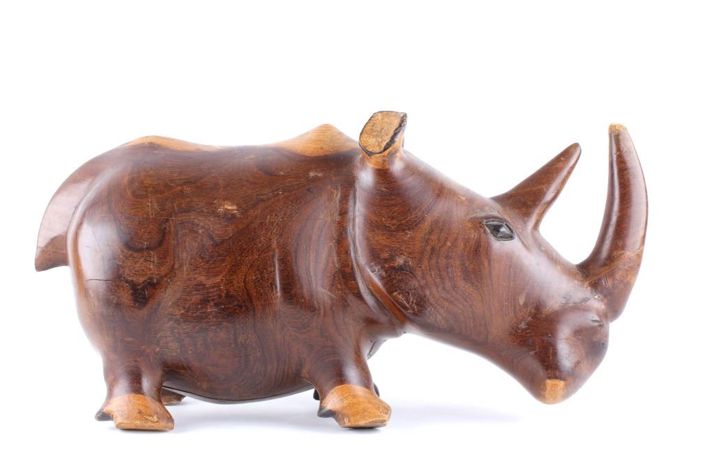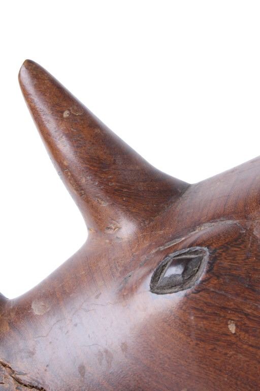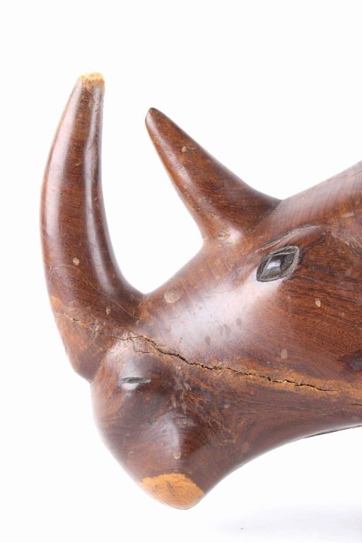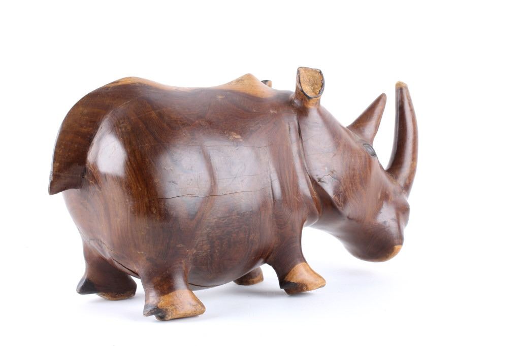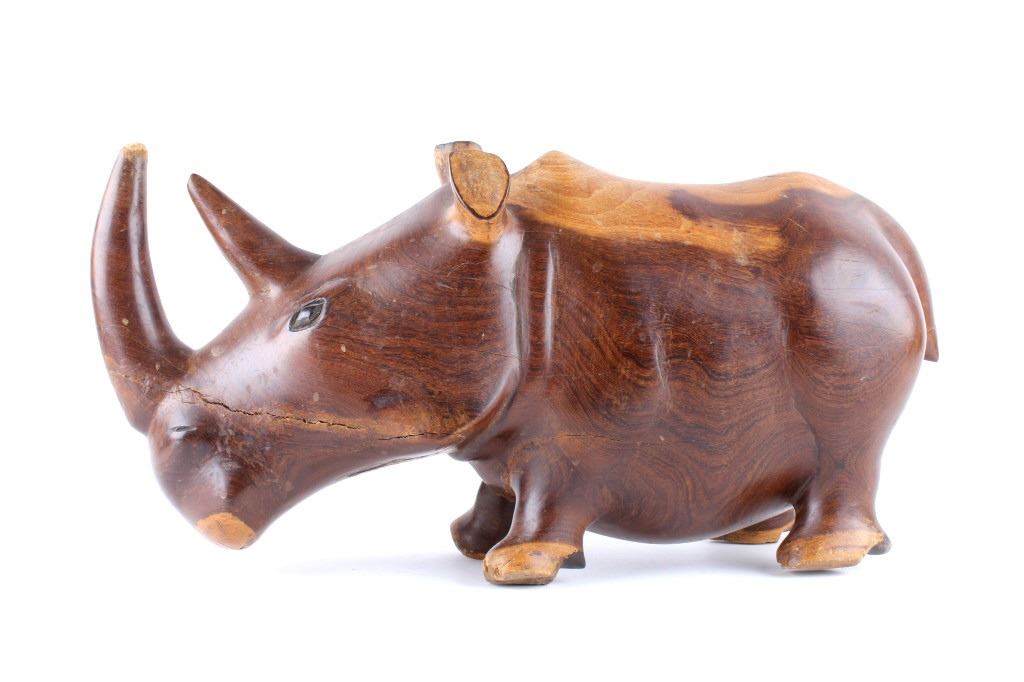 For your consideration is this hand carved and polished rhino made form Acacia circa 1930's. This rhino is well crafted and shows a darker example of  Acacia wood which really brings out the lighter swirl nicely, the rhino sports a large tusk and good attention given to the details on this piece. The condition of this hand carved rhino is good with no obvious signs of damage, there are natural cracks from the wood settling but in good overall condition. The measurements of this rhino are 10" x 20" x 6 1/2".