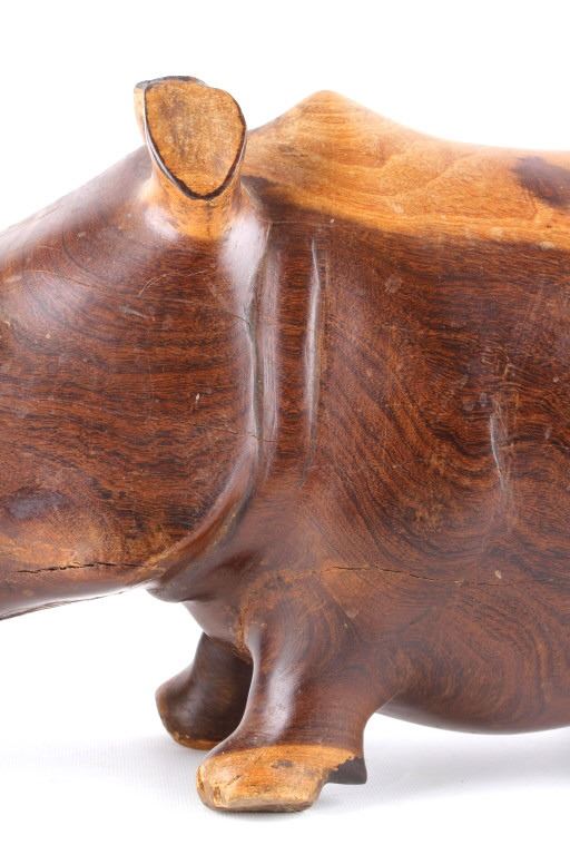 For your consideration is this hand carved and polished rhino made form Acacia circa 1930's. This rhino is well crafted and shows a darker example of Acacia wood which really brings out the lighter swirl nicely, the rhino sports a large tusk and good attention given to the details on this piece. The condition of this hand carved rhino is good with no obvious signs of damage, there are natural cracks from the wood settling but in good overall condition. The measurements of this rhino are 10" x 20" x 6 1/2".