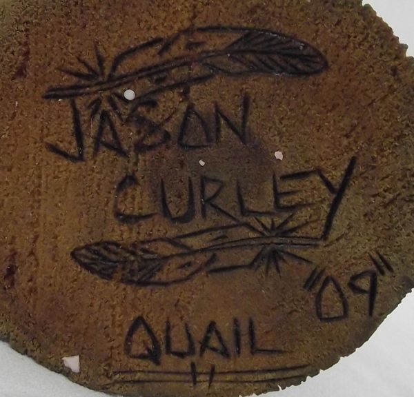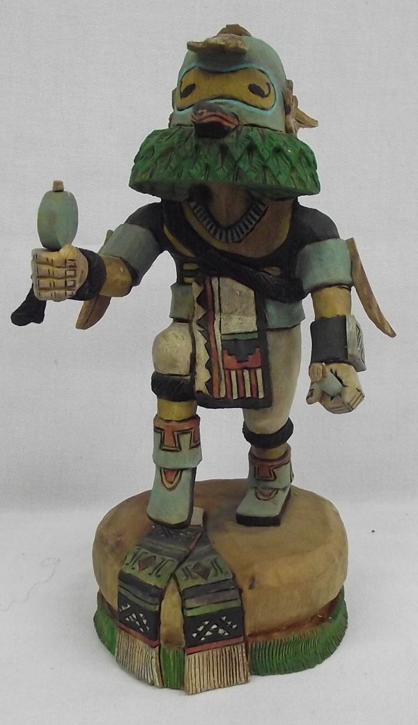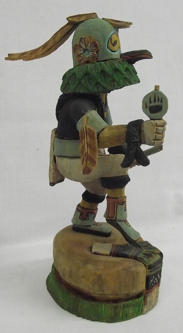 From the Collection of Nick & Suzanne Nicholas. Hand Carved Quail Kachina. This gorgeous piece is painted in vivid colors and is approx. 8'' tall and signed by the artist. (The stick in the right hand is missing an item.)The Quail Kachina's reappearance occurred sometime in the mid-1950's and was reputedly sparked by the dream of a Hopi man. The design of the Kachina's face apparently remains very similar to that of a Kachina doll made around 1900 that is presently in a museum collection in eastern United States.