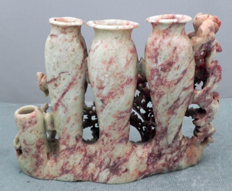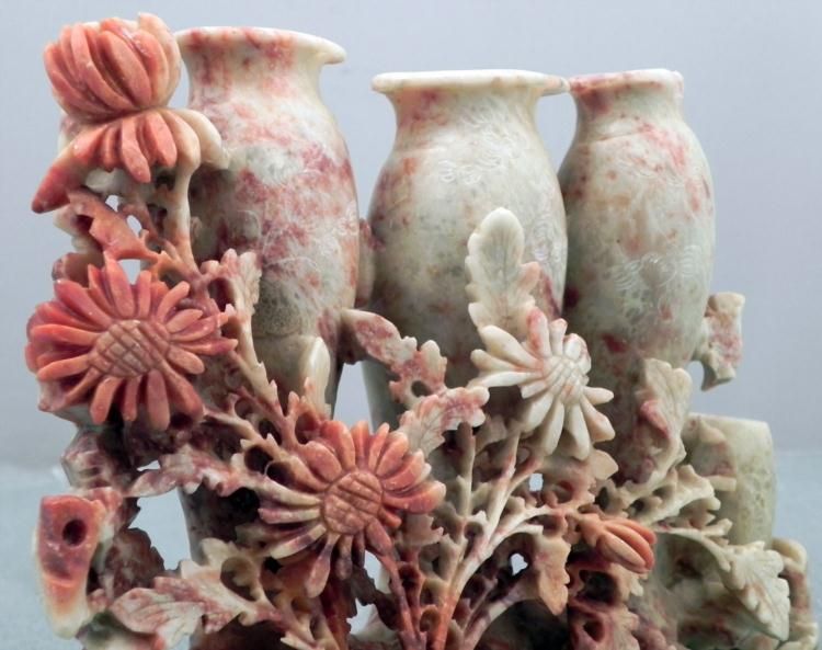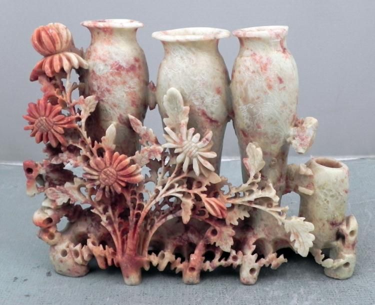 This hand carved piece has a lovely display of delicate flowers and and leaves. The stone it is carved from is tan, and it appears to be soapstone. Its reddish brown tones show strongly on the flowers, giving them color. Four separate vases stand behind * them, for the addition of other flowers if desired. The dimensions are 5 1/2 x 7 x 2 inches. The condition overall is excellent. * * * This is a beautifully detailed piece.