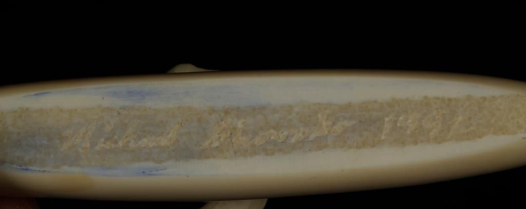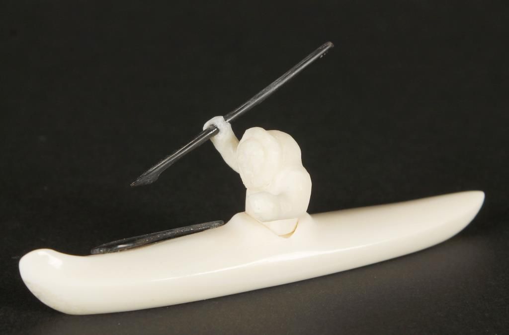 Eskimo in kayak, signed on base. With spear and paddle. 3-3/4" long x 1-1/2" tall.