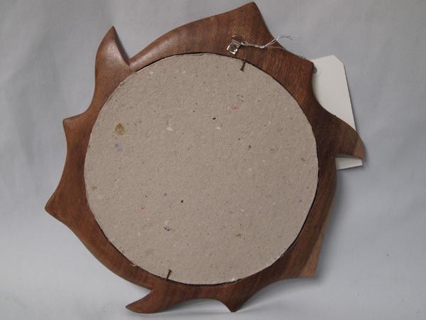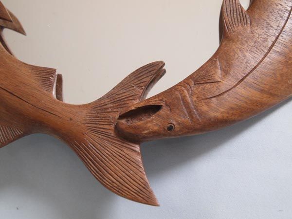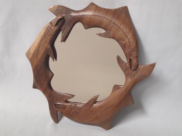 Hand Carved Wood Trout Framed Mirror. Three hand carved Raintree wood trout circle this mirror with a wall hanger on the back. Measures 13.5'' diameter.