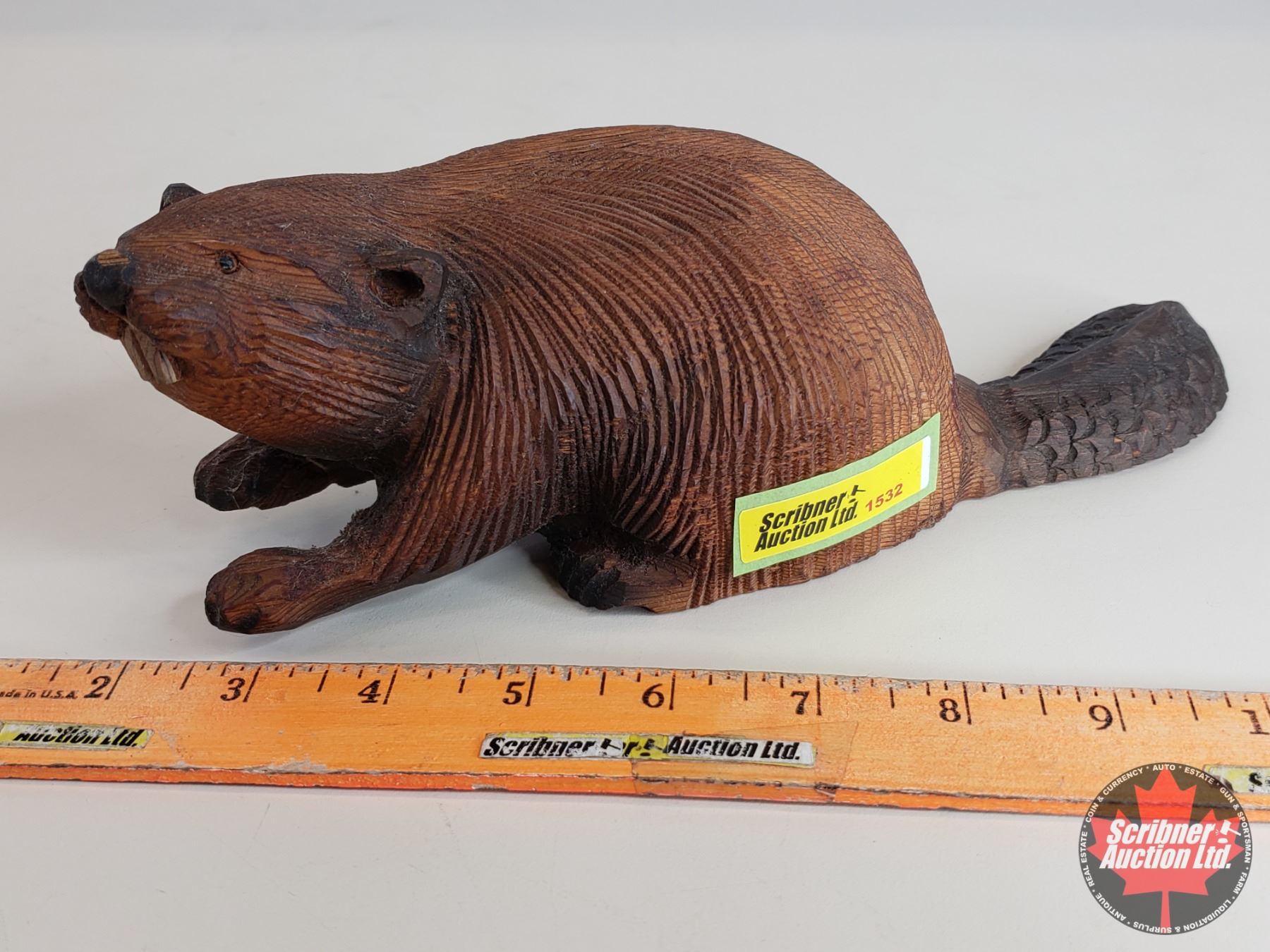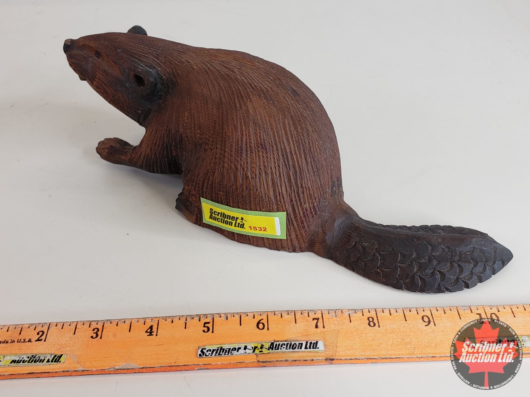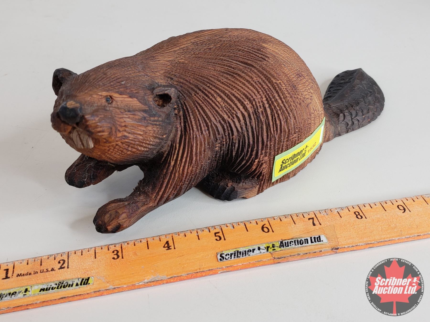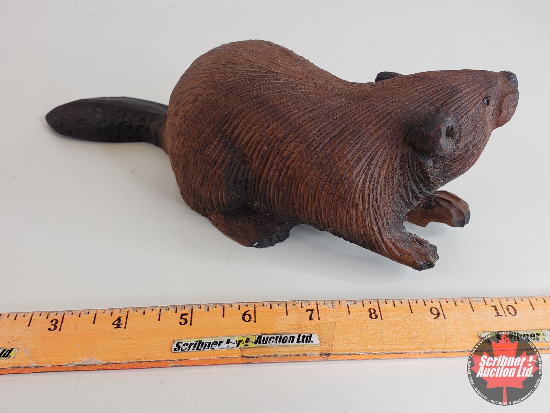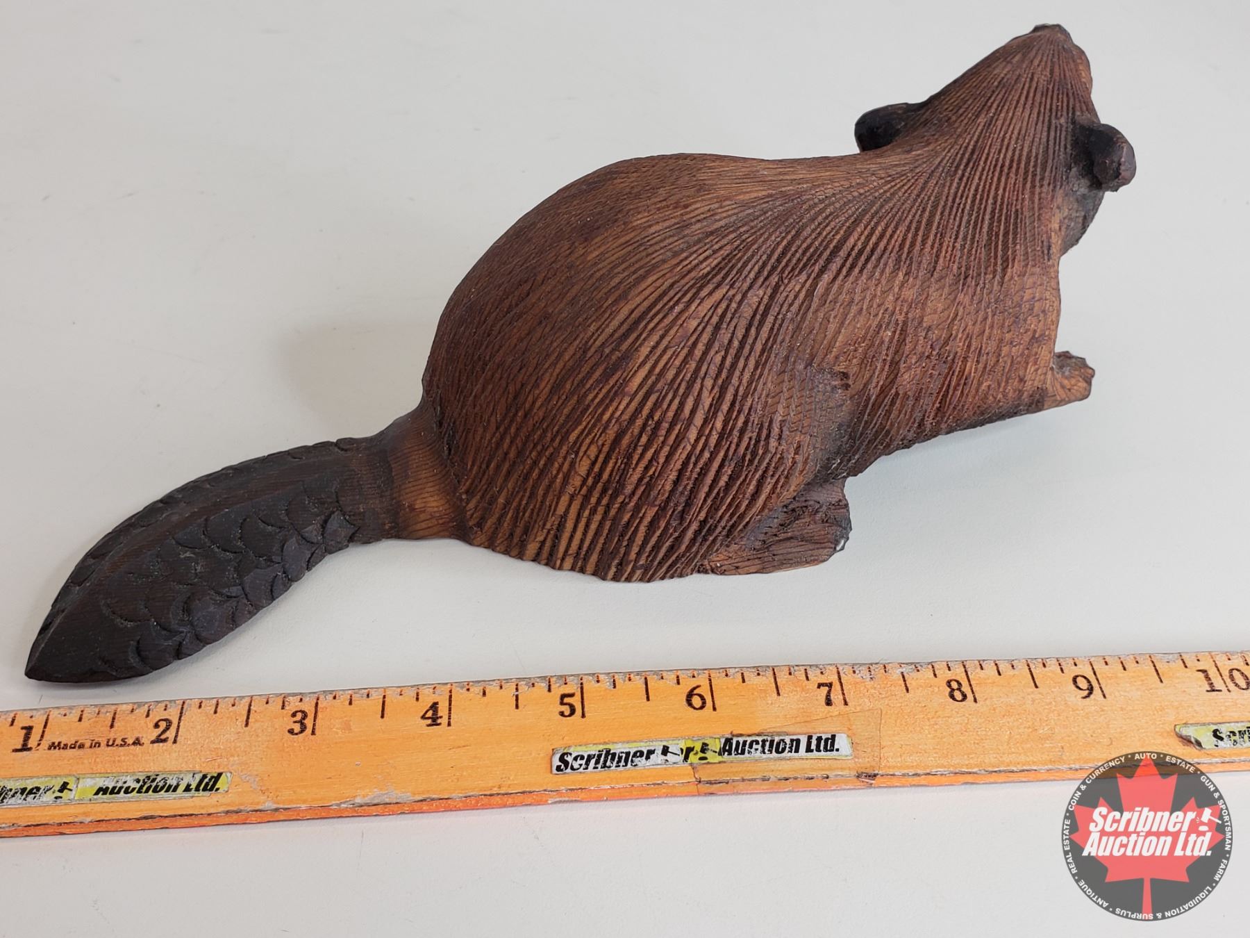 Hand Carved - Wooden Beaver Sculpture (3-3/4"H x 9-3/4"W x 3-1/4"D) (SEE PICS!)