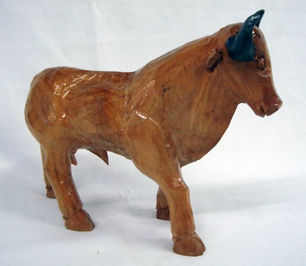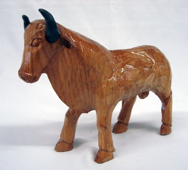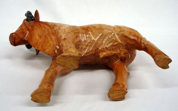 Hand Carved Wooden Bull, anatomically correct, measures approx. 8''H x 9.5''L x 3.25''W