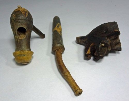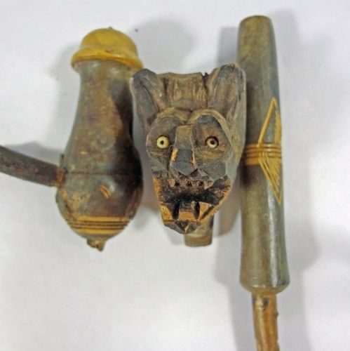 Hand Carved Wooden Pipe featuring a wolf head. Pipe is broken but still a nice piece. Est Value $15-20.00.