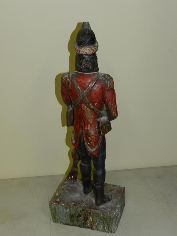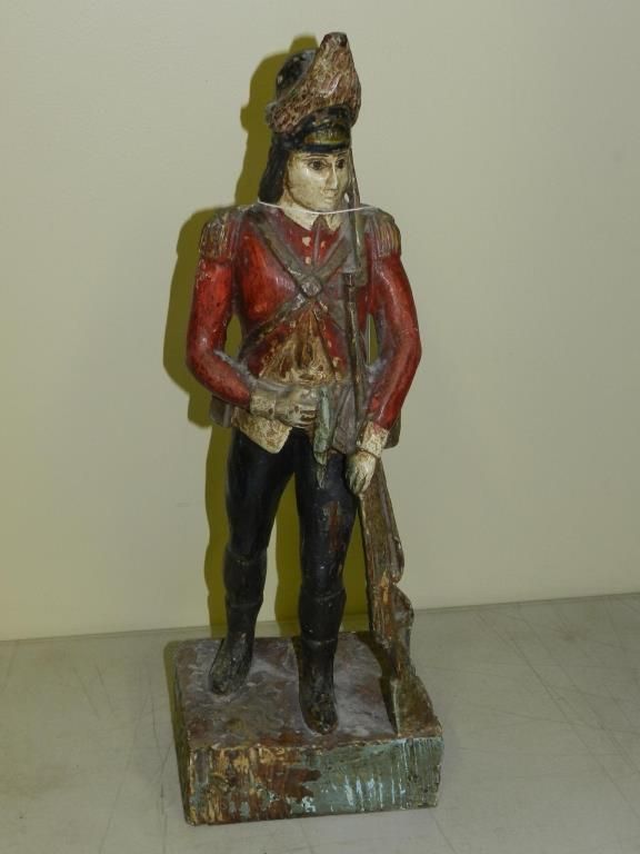 Hand Carved Wooden Soldier, measures approx. 18in high. Depicts a soldier standing with a rifle at his side. Some weathering and cracks, areas of paint loss.