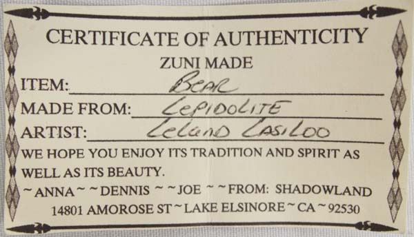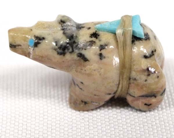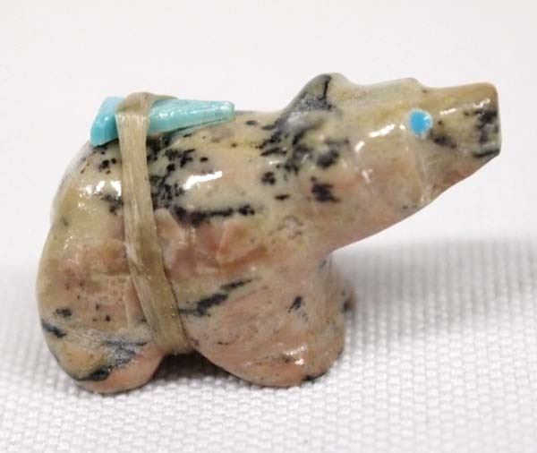 Hand Carved Lepidolite Native American Zuni Bear Fetish by Leland Lasiloo, measures 1''L x 5/8''W, turquoise eyes and arrowhead spirit pack
