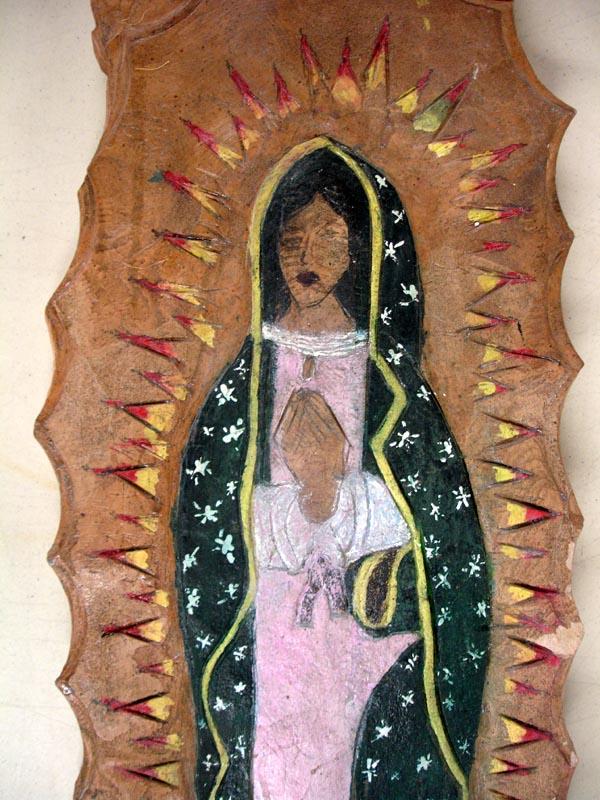 Hand Carved and Painted Stone Virgin of Guadalupe. Measures 37.5''Lx12.5''W. MUST BE PICKED UP.